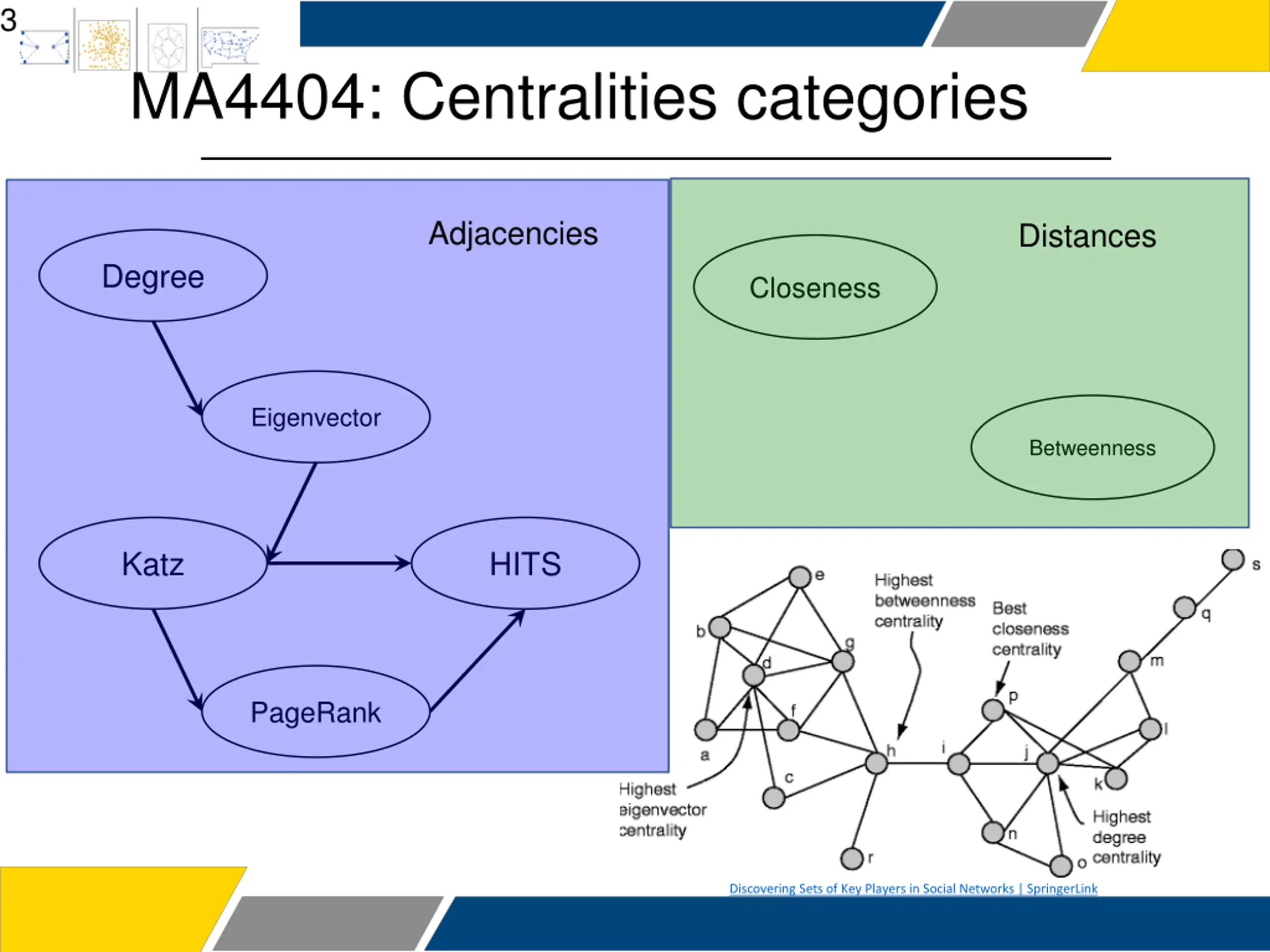 3 MA4404: Centralities categories Adjacencies Distances Degree Closeness Eigenvector Betweenness Katz HITS PageRank Discovering Sets of Key Players in Social Networks | SpringerLink