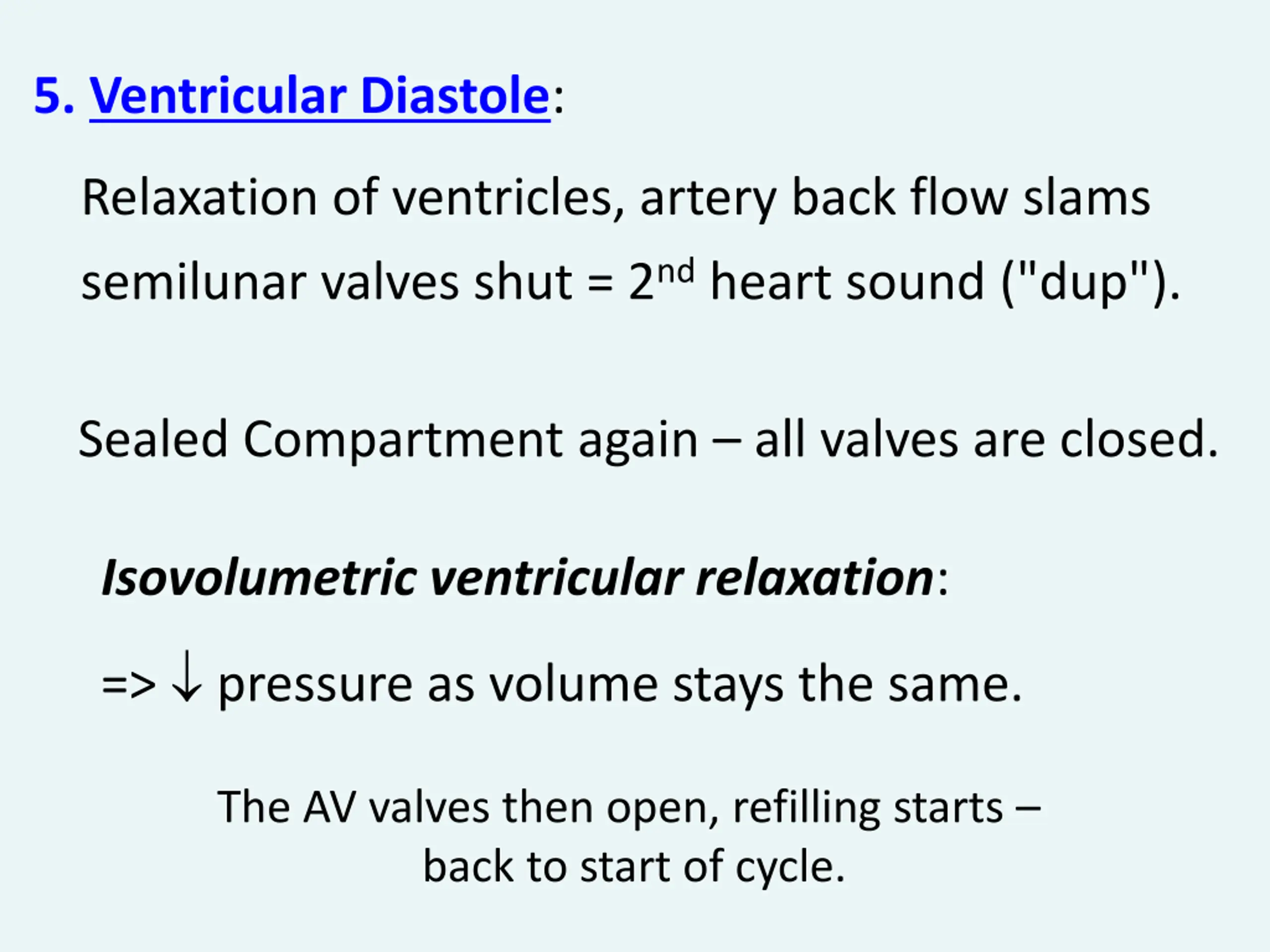 5. Ventricular Diastole: Relaxation of ventricles, artery back flow slams semilunar valves shut = 2nd heart sound ("dup"). Sealed Compartment again all valves are closed. Isovolumetric ventricular relaxation: => pressure as volume stays the same. The AV valves then open, refilling starts back to start of cycle.