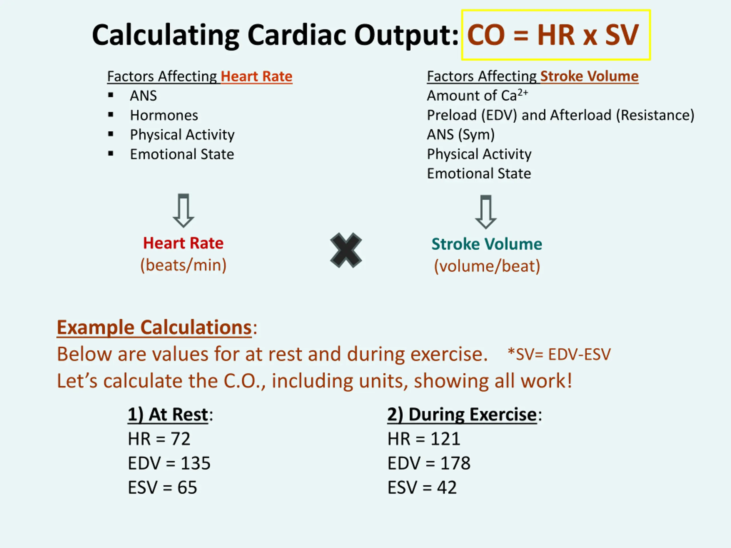 Calculating Cardiac Output: CO = HR x SV Factors Affecting Stroke Volume Amount of Ca2+ Preload (EDV) and Afterload (Resistance) ANS (Sym) Physical Activity Emotional State Factors Affecting Heart Rate ANS Hormones Physical Activity Emotional State Heart Rate (beats/min) Stroke Volume (volume/beat) Example Calculations: Below are values for at rest and during exercise. Let s calculate the C.O., including units, showing all work! *SV= EDV-ESV 1) At Rest: HR = 72 EDV = 135 ESV = 65 2) During Exercise: HR = 121 EDV = 178 ESV = 42