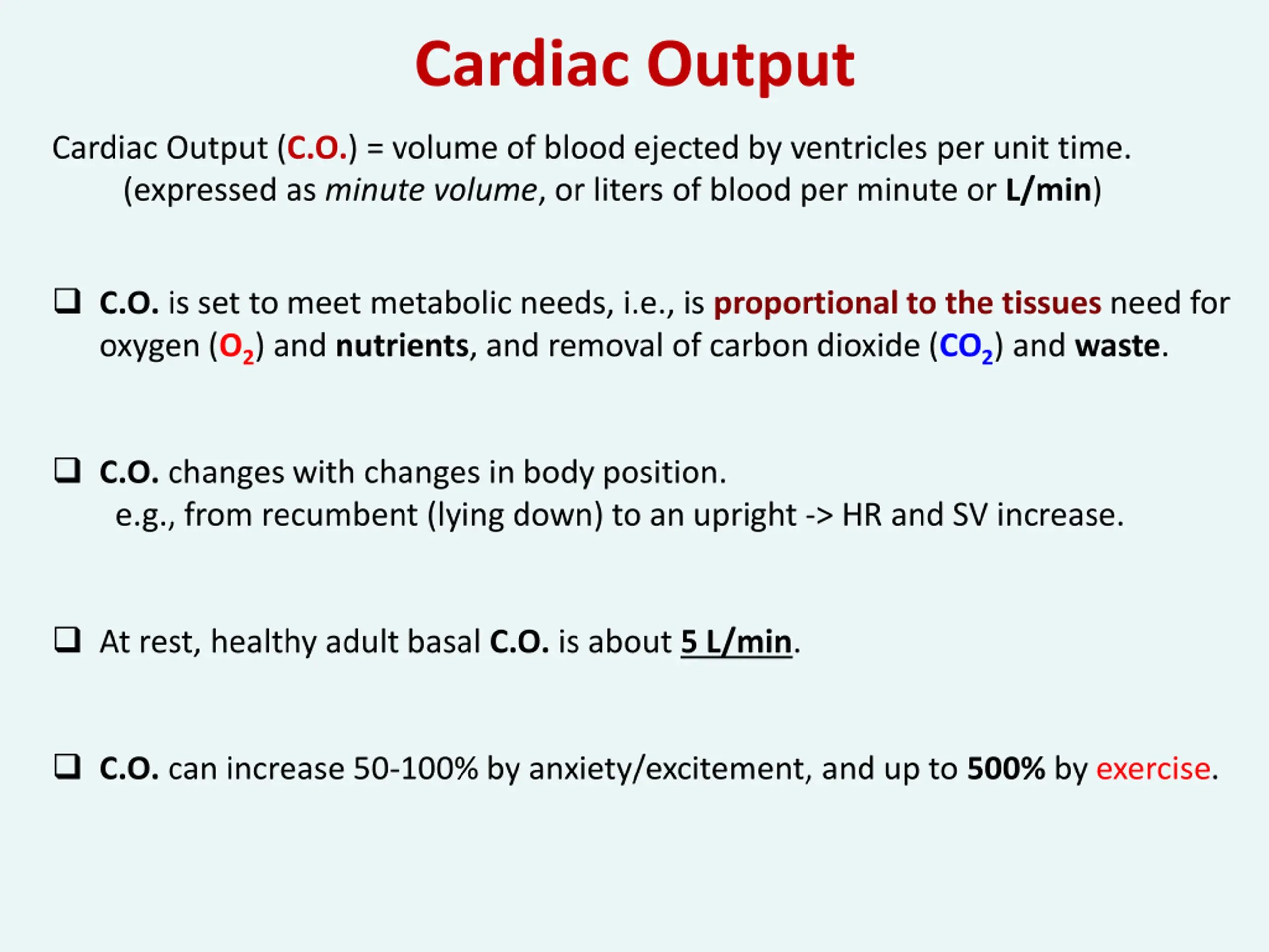 Cardiac Output Cardiac Output (C.O.) = volume of blood ejected by ventricles per unit time. (expressed as minute volume, or liters of blood per minute or L/min) C.O. is set to meet metabolic needs, i.e., is proportional to the tissues need for oxygen (O2) and nutrients, and removal of carbon dioxide (CO2) and waste. C.O. changes with changes in body position. e.g., from recumbent (lying down) to an upright -> HR and SV increase. At rest, healthy adult basal C.O. is about 5 L/min. C.O. can increase 50-100% by anxiety/excitement, and up to 500% by exercise.