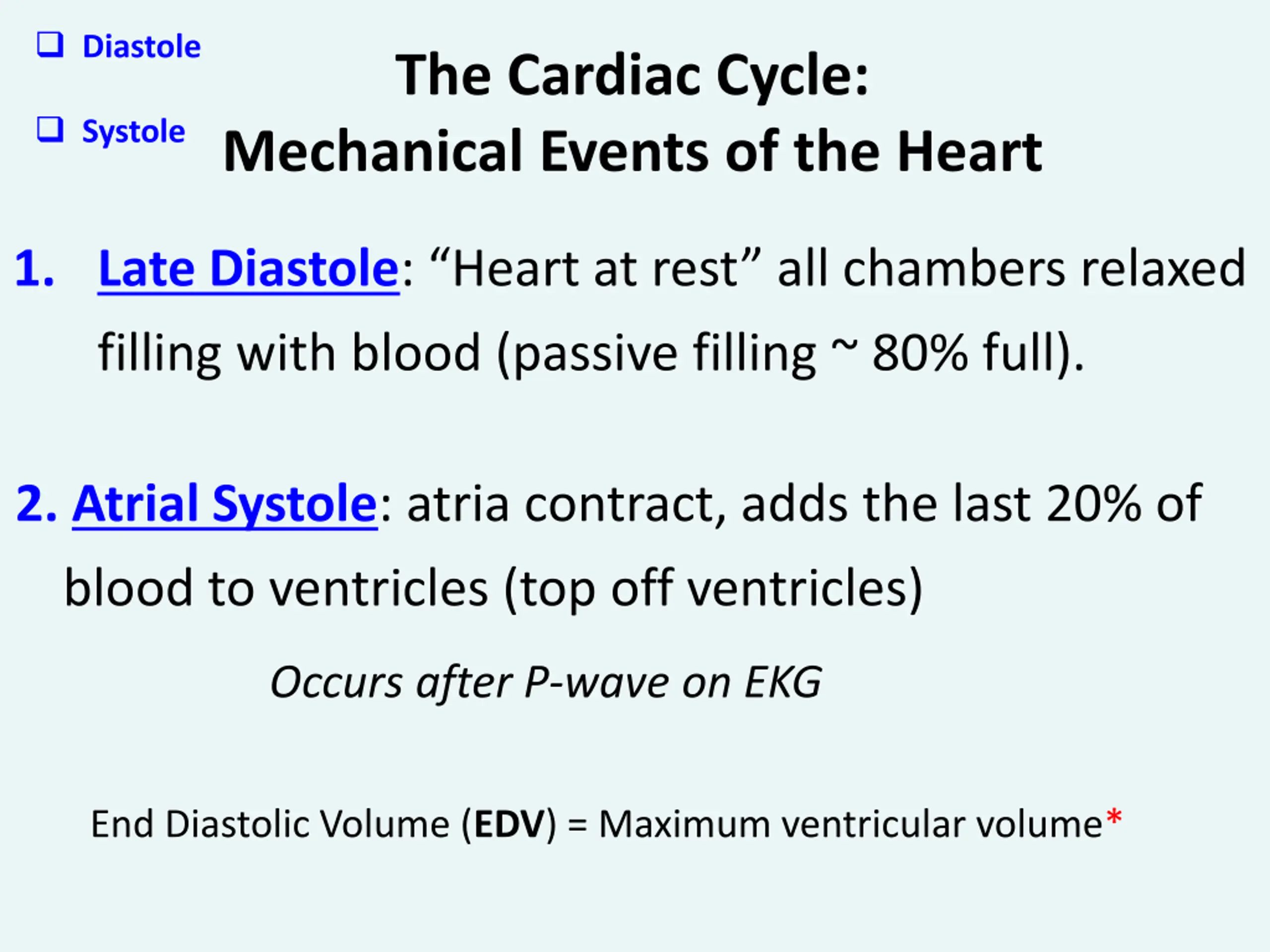 Diastole The Cardiac Cycle: Mechanical Events of the Heart Systole 1. Late Diastole: Heart at rest all chambers relaxed filling with blood (passive filling ~ 80% full). 2. Atrial Systole: atria contract, adds the last 20% of blood to ventricles (top off ventricles) Occurs after P-wave on EKG End Diastolic Volume (EDV) = Maximum ventricular volume*