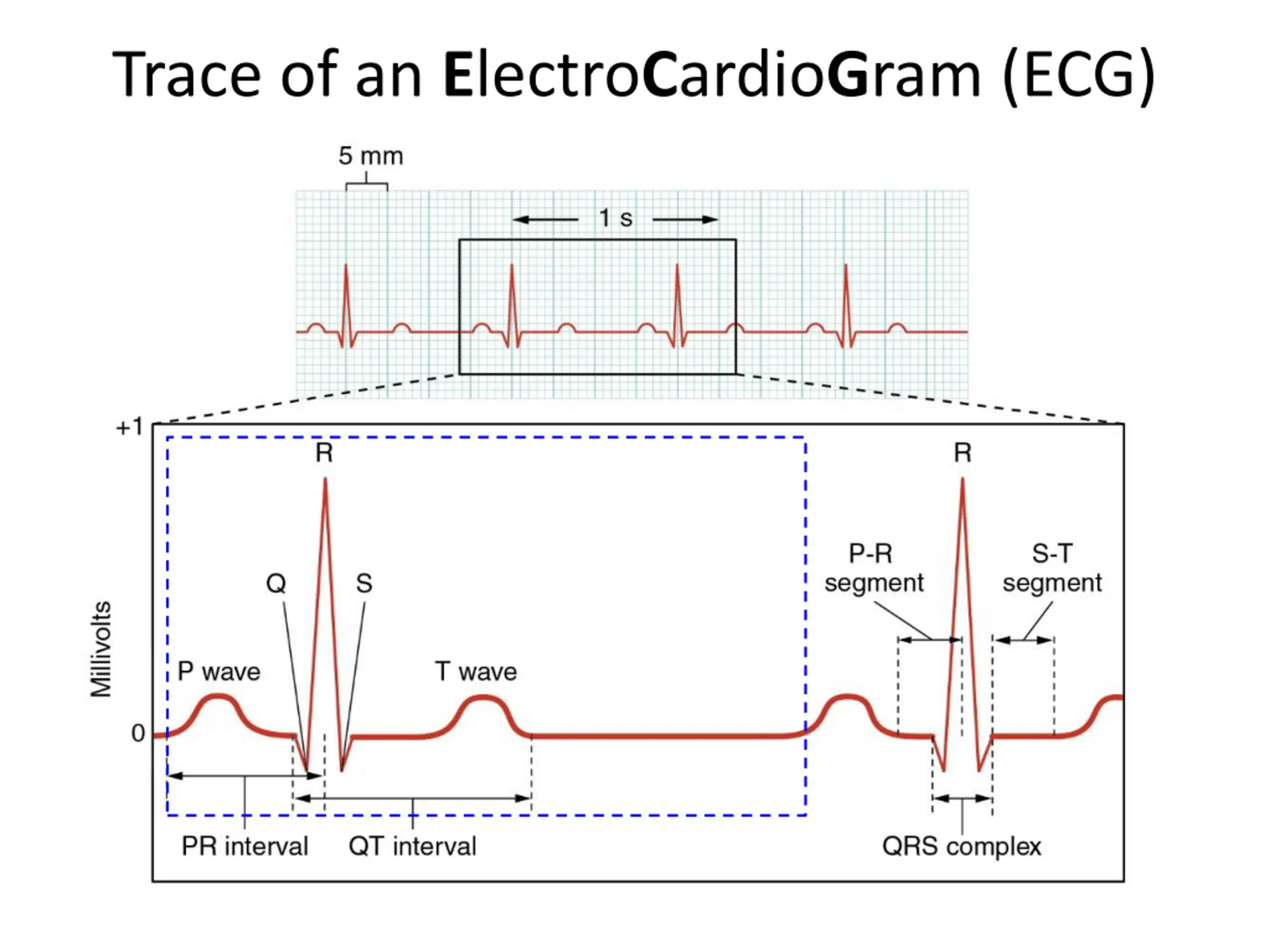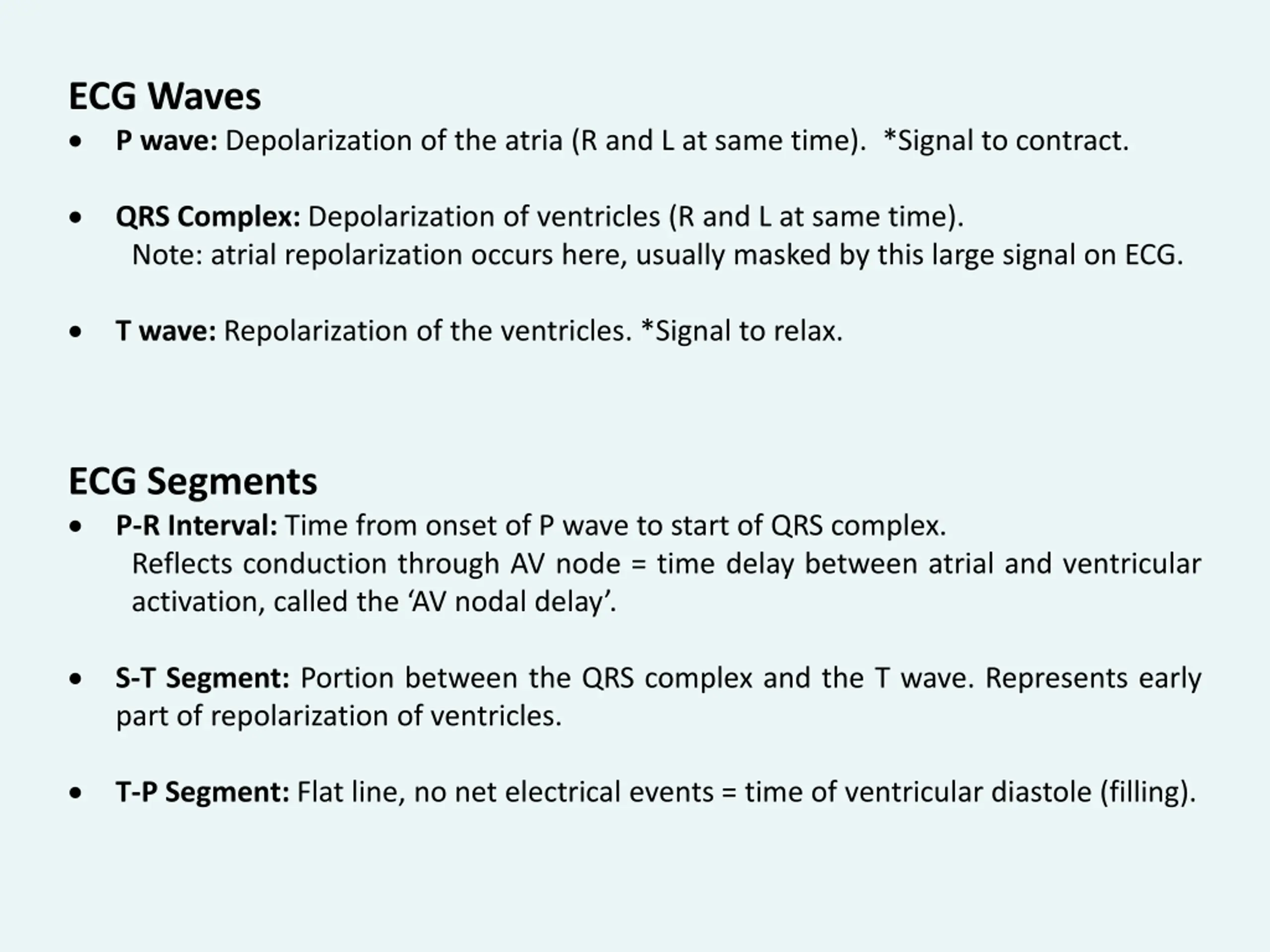 ECG Waves P wave: Depolarization of the atria (R and L at same time). *Signal to contract. QRS Complex: Depolarization of ventricles (R and L at same time). Note: atrial repolarization occurs here, usually masked by this large signal on ECG. T wave: Repolarization of the ventricles. *Signal to relax. ECG Segments P-R Interval: Time from onset of P wave to start of QRS complex. Reflects conduction through AV node = time delay between atrial and ventricular activation, called the AV nodal delay . S-T Segment: Portion between the QRS complex and the T wave. Represents early part of repolarization of ventricles. T-P Segment: Flat line, no net electrical events = time of ventricular diastole (filling).