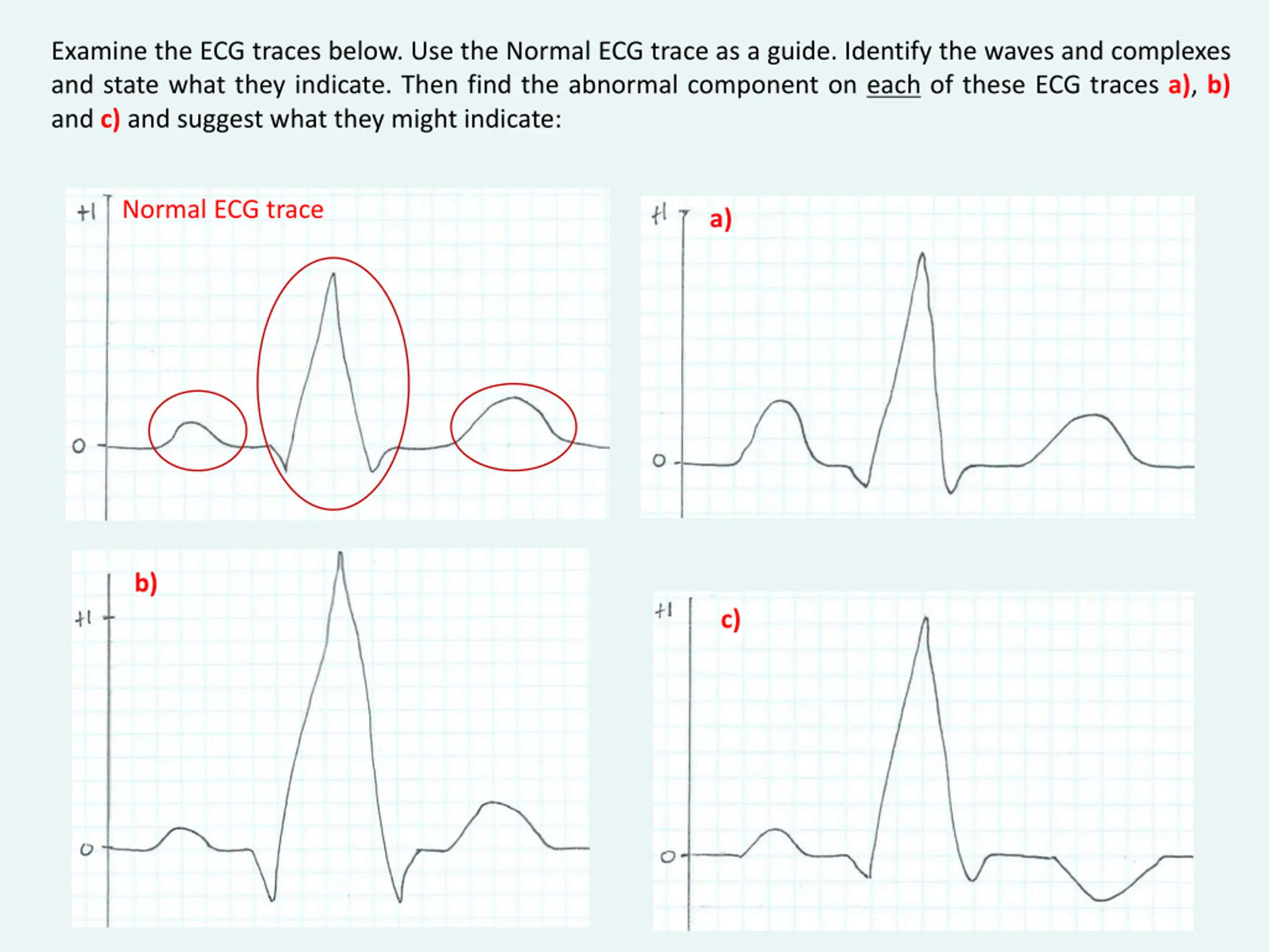 Examine the ECG traces below. Use the Normal ECG trace as a guide. Identify the waves and complexes and state what they indicate. Then find the abnormal component on each of these ECG traces a), b) and c) and suggest what they might indicate: Normal ECG trace a) b) c)