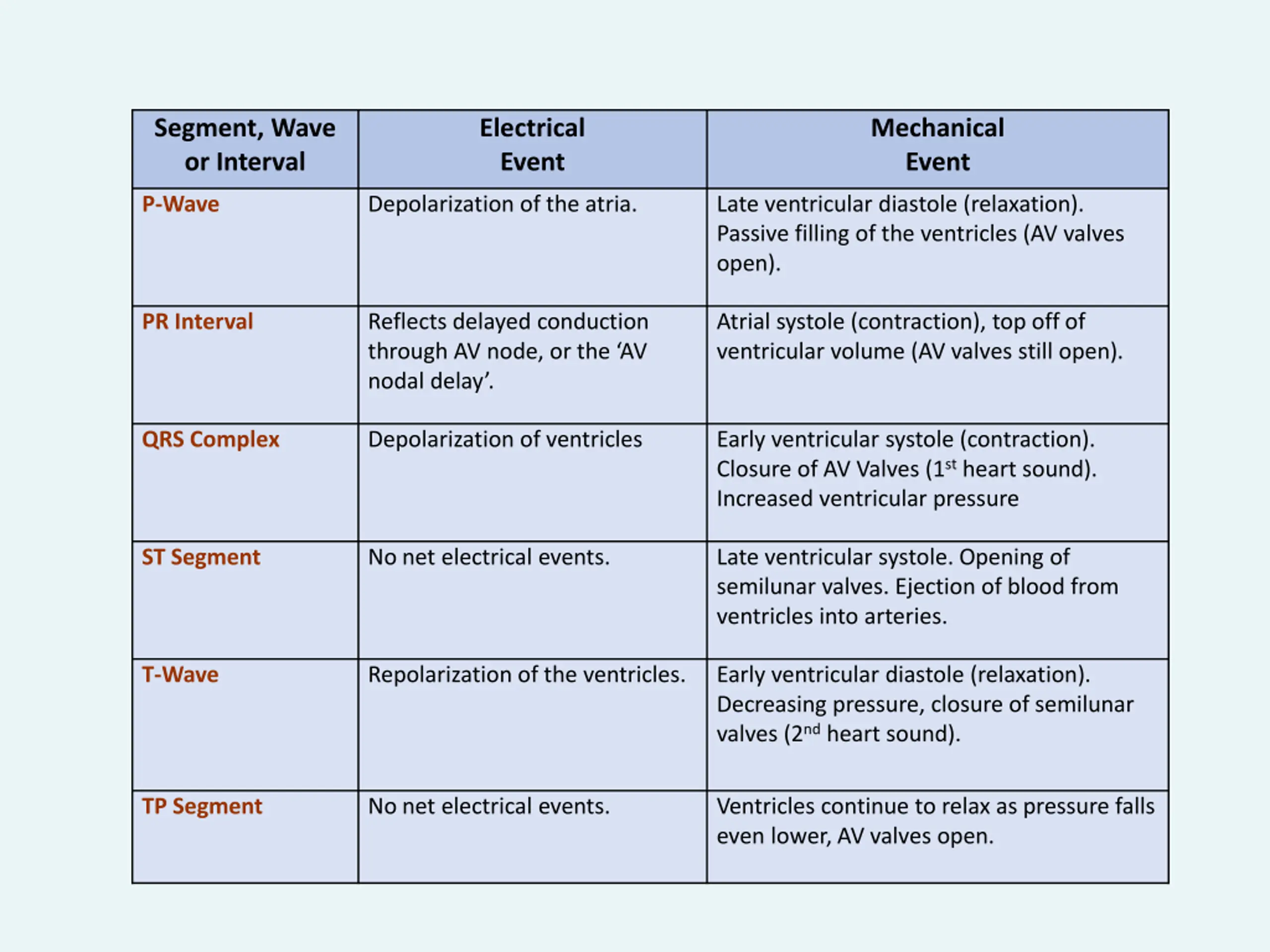 Segment, Wave or Interval Electrical Event Mechanical Event P-Wave Depolarization of the atria. Late ventricular diastole (relaxation). Passive filling of the ventricles (AV valves open). PR Interval Reflects delayed conduction through AV node, or the AV nodal delay . Atrial systole (contraction), top off of ventricular volume (AV valves still open). QRS Complex Depolarization of ventricles Early ventricular systole (contraction). Closure of AV Valves (1st heart sound). Increased ventricular pressure ST Segment No net electrical events. Late ventricular systole. Opening of semilunar valves. Ejection of blood from ventricles into arteries. T-Wave Repolarization of the ventricles. Early ventricular diastole (relaxation). Decreasing pressure, closure of semilunar valves (2nd heart sound). TP Segment No net electrical events. Ventricles continue to relax as pressure falls even lower, AV valves open.