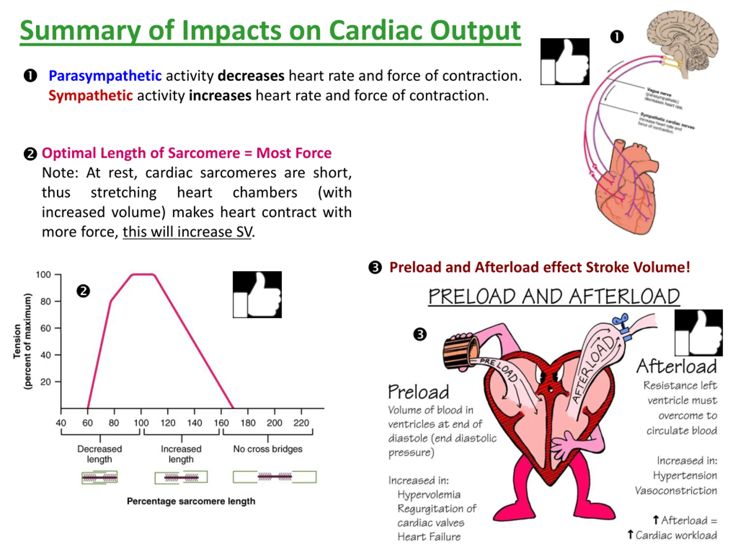 Summary of Impacts on Cardiac Output Parasympathetic activity decreases heart rate and force of contraction. Sympathetic activity increases heart rate and force of contraction. Optimal Length of Sarcomere = Most Force Note: At rest, cardiac sarcomeres are short, thus stretching heart increased volume) makes heart contract with more force, this will increase SV. chambers (with Preload and Afterload effect Stroke Volume!