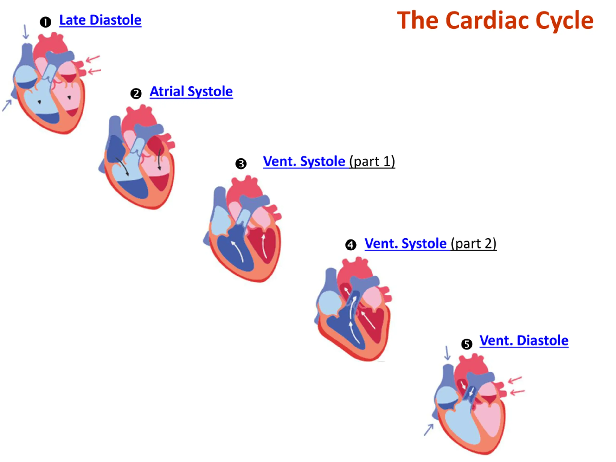The Cardiac Cycle Late Diastole Atrial Systole Vent. Systole (part 1) Vent. Systole (part 2) Vent. Diastole