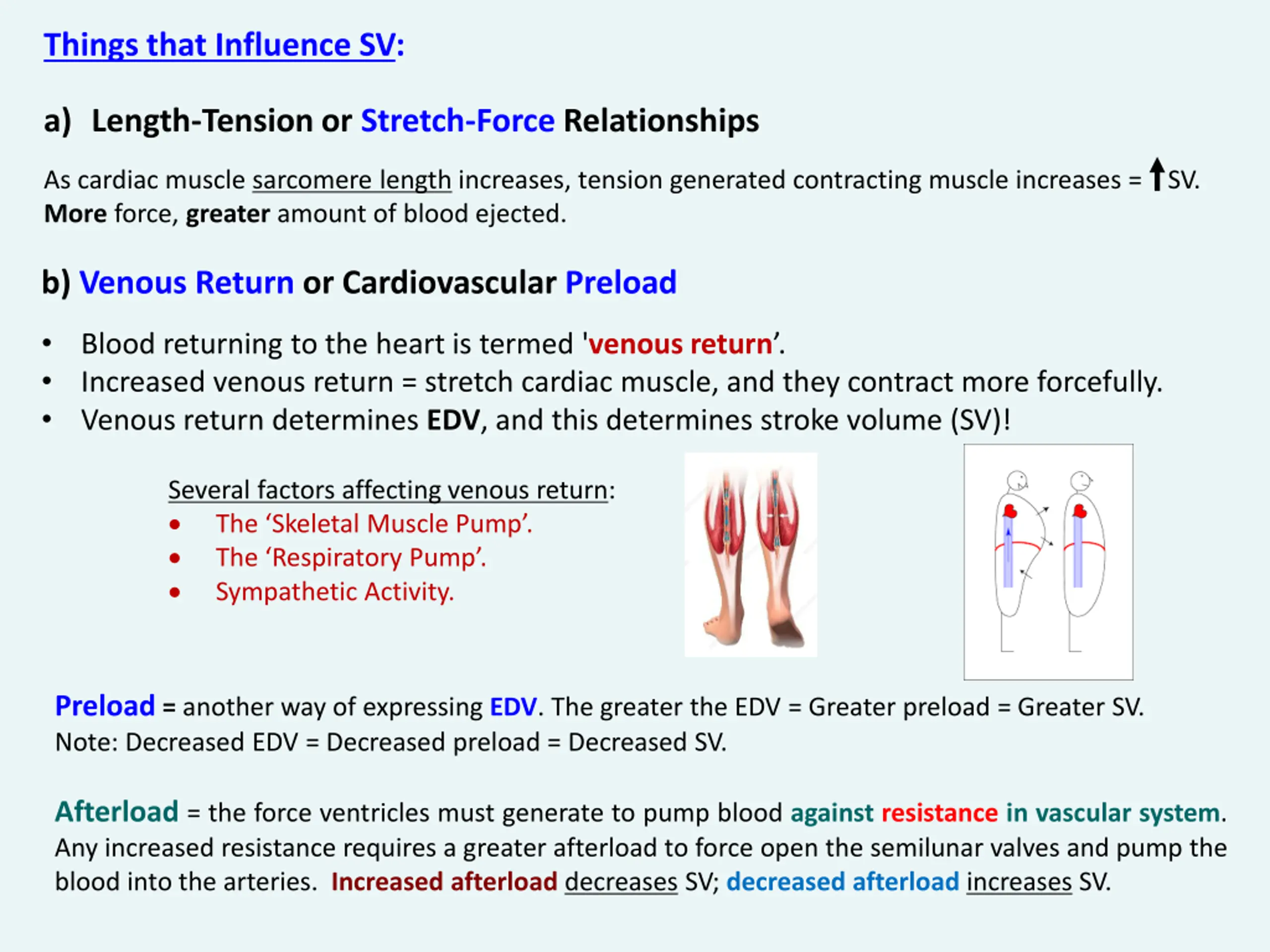 Things that Influence SV: a) Length-Tension or Stretch-Force Relationships As cardiac muscle sarcomere length increases, tension generated contracting muscle increases = SV. More force, greater amount of blood ejected. b)Venous Return or Cardiovascular Preload Blood returning to the heart is termed 'venous return . Increased venous return = stretch cardiac muscle, and they contract more forcefully. Venous return determines EDV, and this determines stroke volume (SV)! Several factors affecting venous return: The Skeletal Muscle Pump . The RespiratoryPump . Sympathetic Activity. Preload = another way of expressing EDV. The greater the EDV = Greater preload = Greater SV. Note: Decreased EDV = Decreased preload = Decreased SV. Afterload = the force ventricles must generate to pump blood against resistance in vascular system. Any increased resistance requires a greater afterload to force open the semilunar valves and pump the blood into the arteries. Increased afterload decreases SV; decreased afterload increases SV.