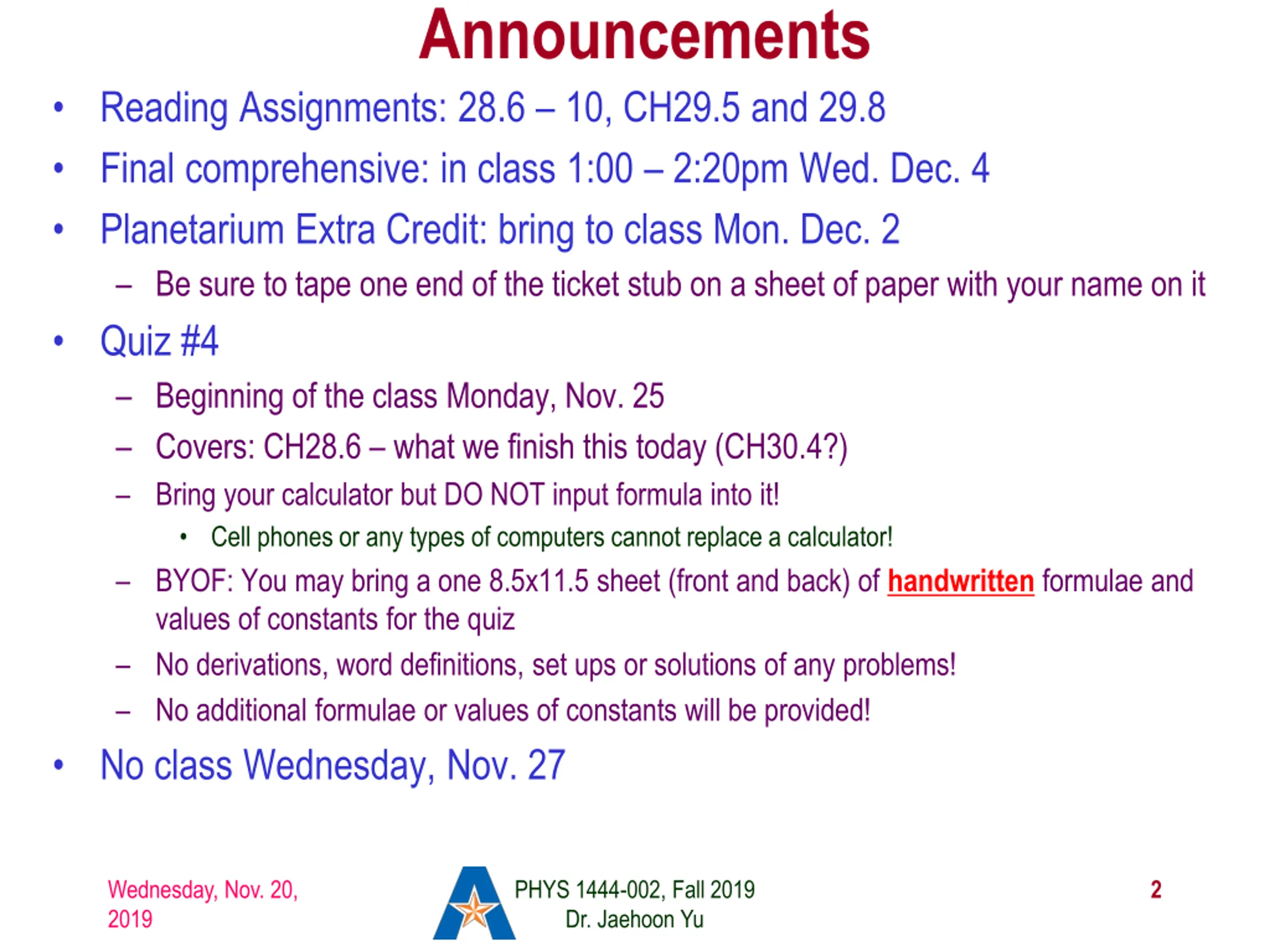 Announcements Reading Assignments: 28.6 10, CH29.5 and 29.8 Final comprehensive: in class 1:00 2:20pm Wed. Dec. 4 Planetarium Extra Credit: bring to class Mon. Dec. 2 Be sure to tape one end of the ticket stub on a sheet of paper with your name on it Quiz #4 Beginning of the class Monday, Nov. 25 Covers: CH28.6 what we finish this today (CH30.4?) Bring your calculator but DO NOT input formula into it! Cell phones or any types of computers cannot replace a calculator! BYOF: You may bring a one 8.5x11.5 sheet (front and back) of handwritten formulae and values of constants for the quiz No derivations, word definitions, set ups or solutions of any problems! No additional formulae or values of constants will be provided! No class Wednesday, Nov. 27 Wednesday, Nov. 20, 2019 PHYS 1444-002, Fall 2019 Dr. Jaehoon Yu 2