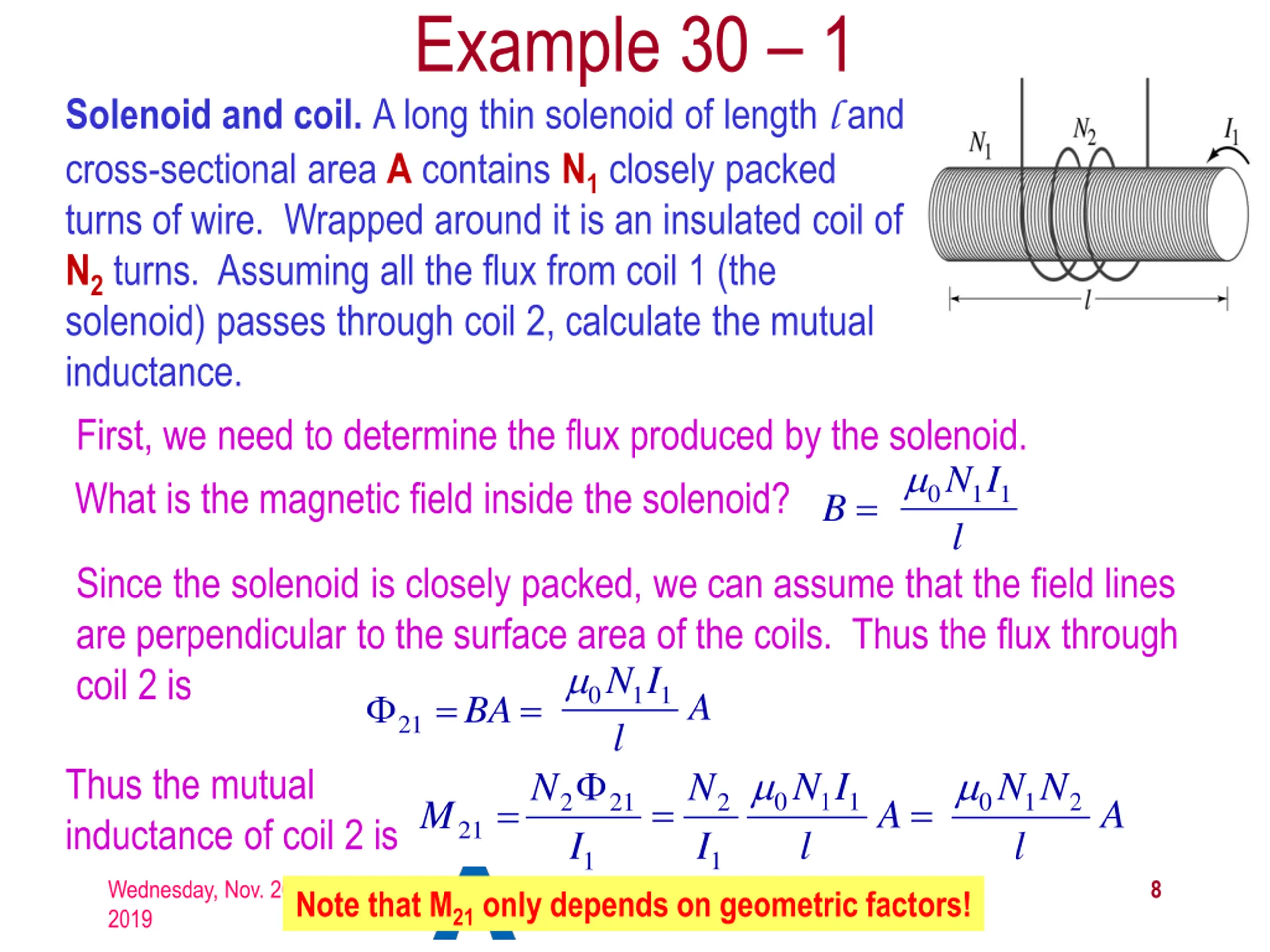 Example 30 1 Solenoid and coil. A long thin solenoid of length l and cross-sectional area A contains N1 closely packed turns of wire. Wrapped around it is an insulated coil of N2 turns. Assuming all the flux from coil 1 (the solenoid) passes through coil 2, calculate the mutual inductance. First, we need to determine the flux produced by the solenoid. What is the magnetic field inside the solenoid? N I l 0 1 1 B = Since the solenoid is closely packed, we can assume that the field lines are perpendicular to the surface area of the coils. Thus the flux through coil 2 is 21 = BA= l N I N I 0 1 1 A Thus the mutual inductance of coil 2 is N I l N N l N I 0 1 1 0 1 2 = = 2 21 2 = A A M 21 1 1 Wednesday, Nov. 20, 2019 PHYS 1444-002, Fall 2019 Dr. Jaehoon Yu 8 Note that M21 only depends on geometric factors!