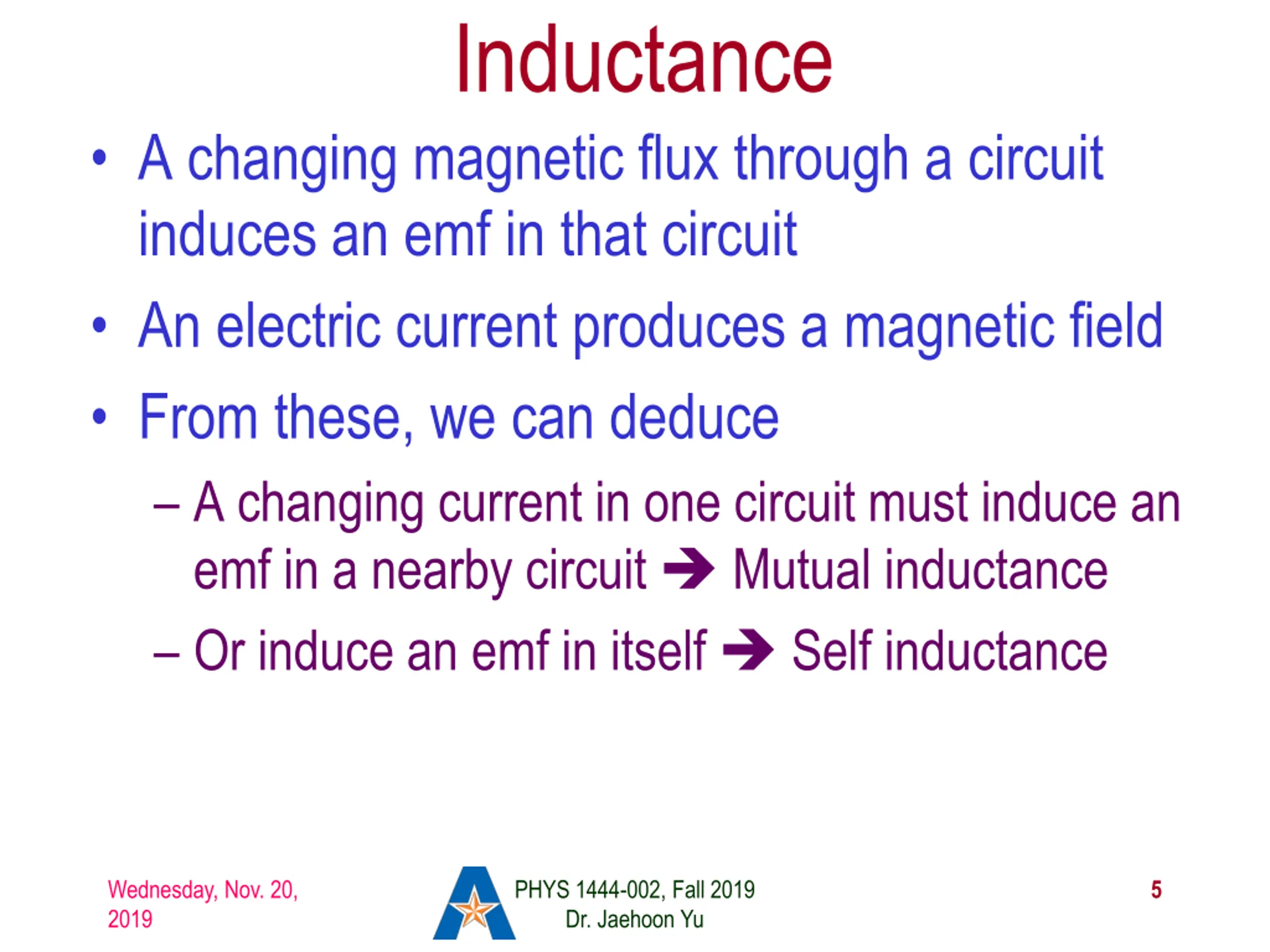 Inductance A changing magnetic flux through a circuit induces an emf in that circuit An electric current produces a magnetic field From these, we can deduce A changing current in one circuit must induce an emf in a nearby circuit Mutual inductance Or induce an emf in itself Self inductance Wednesday, Nov. 20, 2019 PHYS 1444-002, Fall 2019 Dr. Jaehoon Yu 5