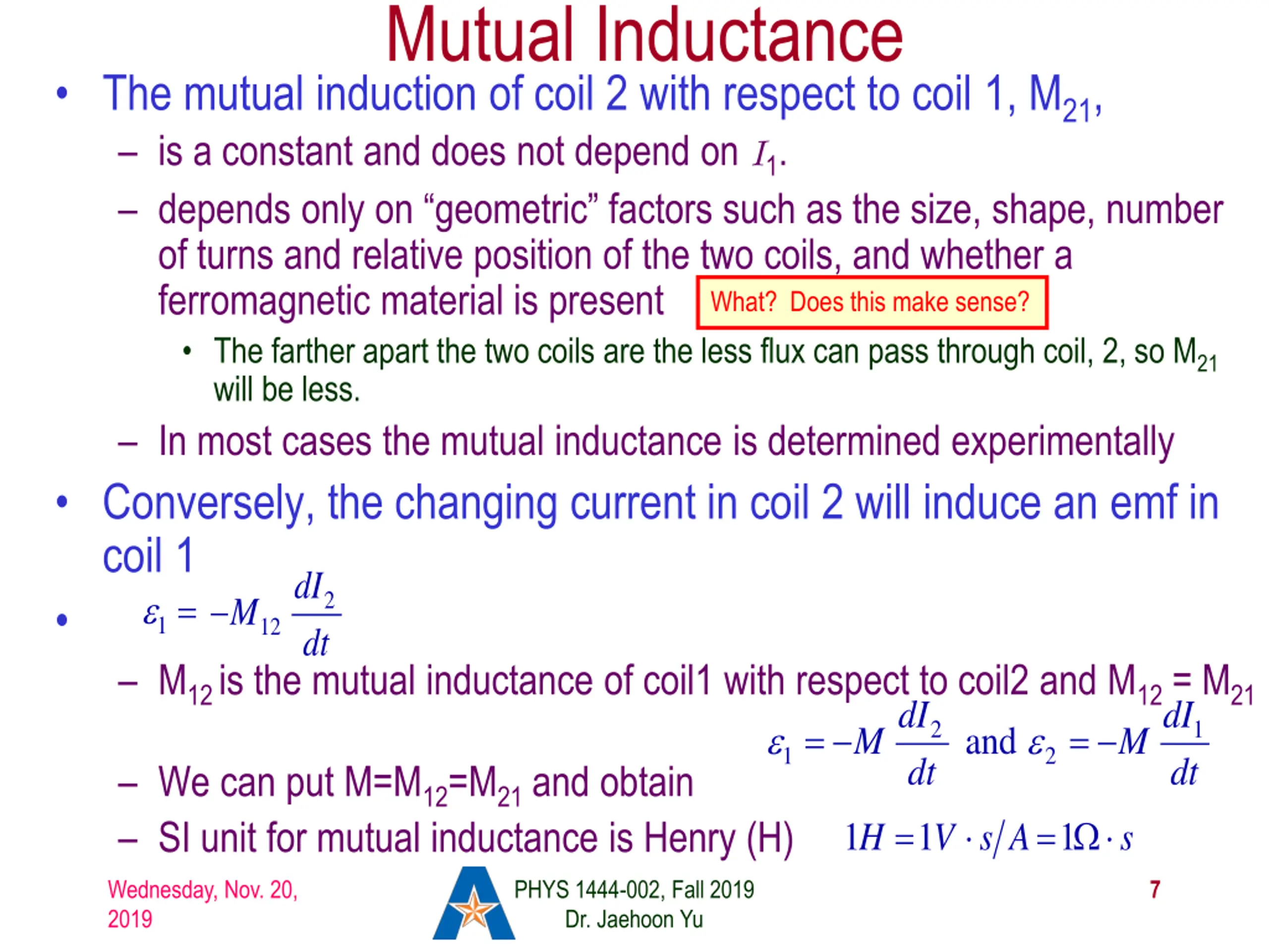 Mutual Inductance If two coils of wire are placed near each other, a changing current in one will induce an emf in the other. What is the induced emf, 2, in coil 2 proportional to? Rate of the change of the magnetic flux passing through it This flux is due to current I1 in coil 1 If 21 is the magnetic flux in each loop of coil 2 created by coil1 and N2 is the number of closely packed loops in coil 2, then N2 21 is the total flux passing through coil 2. If the two coils are fixed in space, N2 21 is proportional to the current I1 in coil 1, . The proportionality constant for this is called the Mutual Inductance and defined as . The emf induced in coil 2 due to the changing current in coil 1 is ( 2 21 21 2 2 N dt dt N = I 21 M 2 21 1 = M N I 21 2 21 1 ) d N d dI dt = = = 1 M 21 Wednesday, Nov. 20, 2019 PHYS 1444-002, Fall 2019 Dr. Jaehoon Yu 6