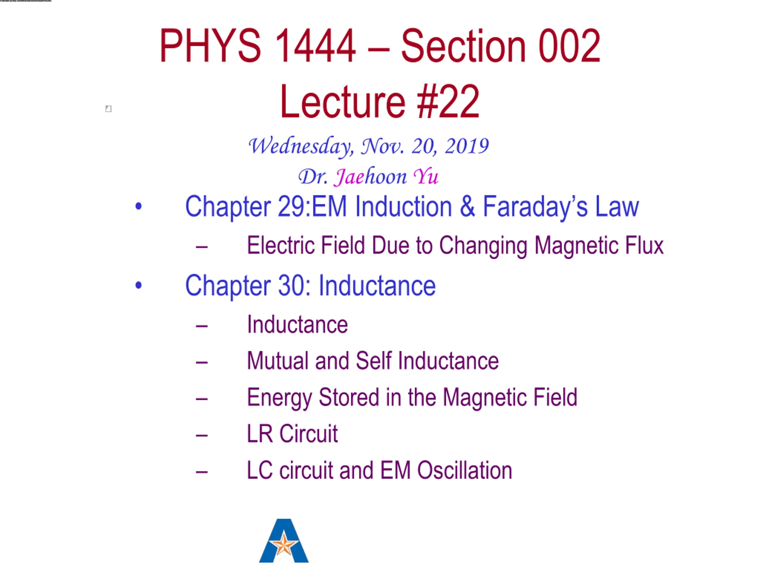 PHYS 1444 Section 002 Lecture #22 Wednesday, Nov. 20, 2019 Dr. Jaehoon Yu Chapter 29:EM Induction & Faraday s Law Electric Field Due to Changing Magnetic Flux Chapter 30: Inductance Inductance Mutual and Self Inductance Energy Stored in the Magnetic Field LR Circuit LC circuit and EM Oscillation