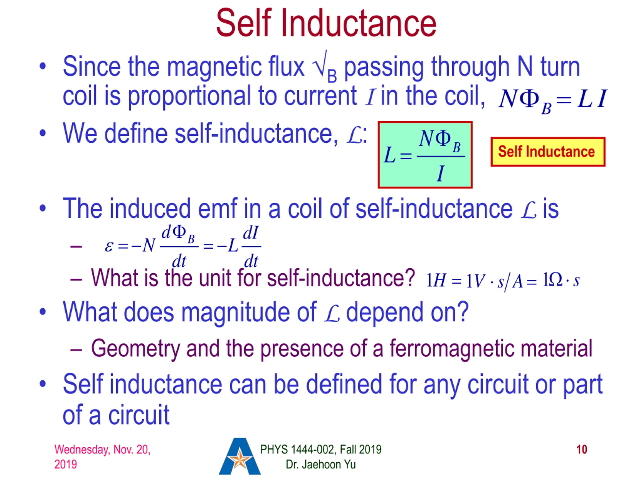 Self Inductance The concept of inductance applies to a single isolated coil of N turns. How does this happen? When a changing current passes through a coil A changing magnetic flux is produced inside the coil The changing magnetic flux in turn induces an emf in the same coil This emf opposes the change in flux. Whose law is this? Lenz s law What would this do? When the current through the coil is increasing? The increasing magnetic flux induces an emf that opposes the original current This tends to impedes its increase, trying to maintain the original current When the current through the coil is decreasing? The decreasing flux induces an emf in the same direction as the current This tends to increase the flux, trying to maintain the original current Wednesday, Nov. 20, 2019 PHYS 1444-002, Fall 2019 Dr. Jaehoon Yu 9