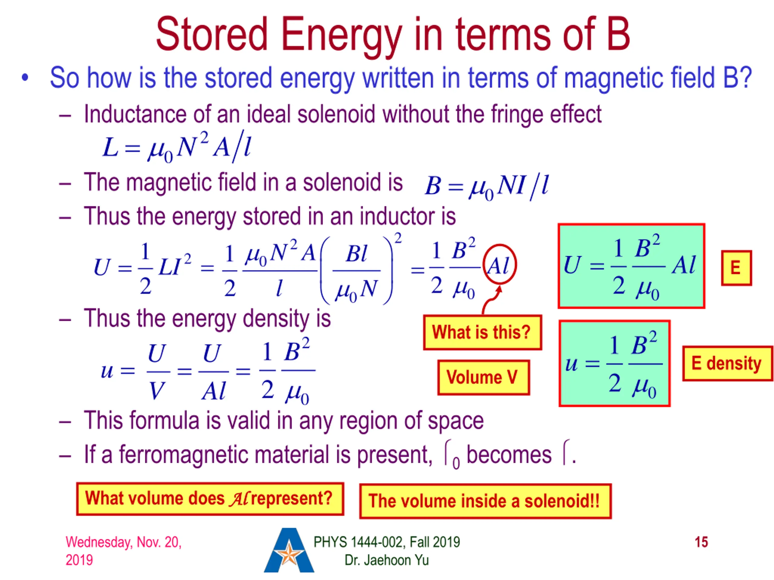 Stored Energy in terms of B So how is the stored energy written in terms of magnetic field B? Inductance of an ideal solenoid without the fringe effect L = 2 0N A l 0NI l The magnetic field in a solenoid is Thus the energy stored in an inductor is 1 2LI = 2 B = 2 2 1 2 B 2 2 1 2 B N A l 1 Bl = U Al 2 U = Al = 0 E N 0 0 0 Thus the energy density is U V What is this? 2 1 2 B 2 1 2 B =U = u u = E density Al= Volume V 0 0 This formula is valid in any region of space If a ferromagnetic material is present, 0 becomes . What volume does Al Al represent? The volume inside a solenoid!! Wednesday, Nov. 20, 2019 PHYS 1444-002, Fall 2019 Dr. Jaehoon Yu 15