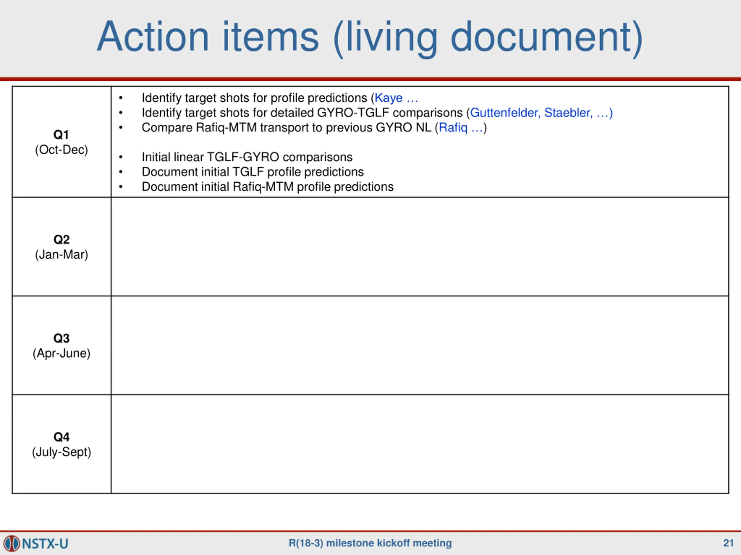 Action items (living document) Identify target shots for profile predictions (Kaye Identify target shots for detailed GYRO-TGLF comparisons (Guttenfelder, Staebler, ) Compare Rafiq-MTM transport to previous GYRO NL (Rafiq ) Q1 (Oct-Dec) Initial linear TGLF-GYRO comparisons Document initial TGLF profile predictions Document initial Rafiq-MTM profile predictions Q2 (Jan-Mar) Q3 (Apr-June) Q4 (July-Sept) R(18-3) milestone kickoff meeting 21