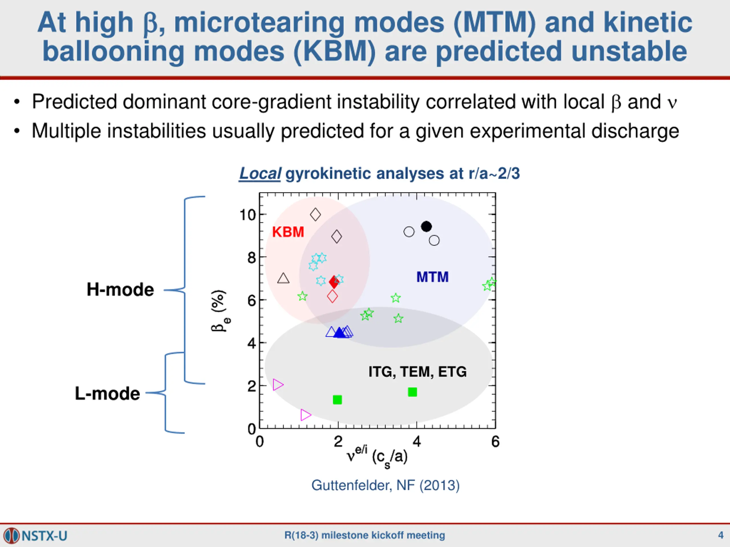 At high , microtearing modes (MTM) and kinetic ballooning modes (KBM) are predicted unstable Predicted dominant core-gradient instability correlated with local and Multiple instabilities usually predicted for a given experimental discharge Local gyrokinetic analyses at r/a~2/3 KBM MTM H-mode ITG, TEM, ETG L-mode Guttenfelder, NF (2013) R(18-3) milestone kickoff meeting 4