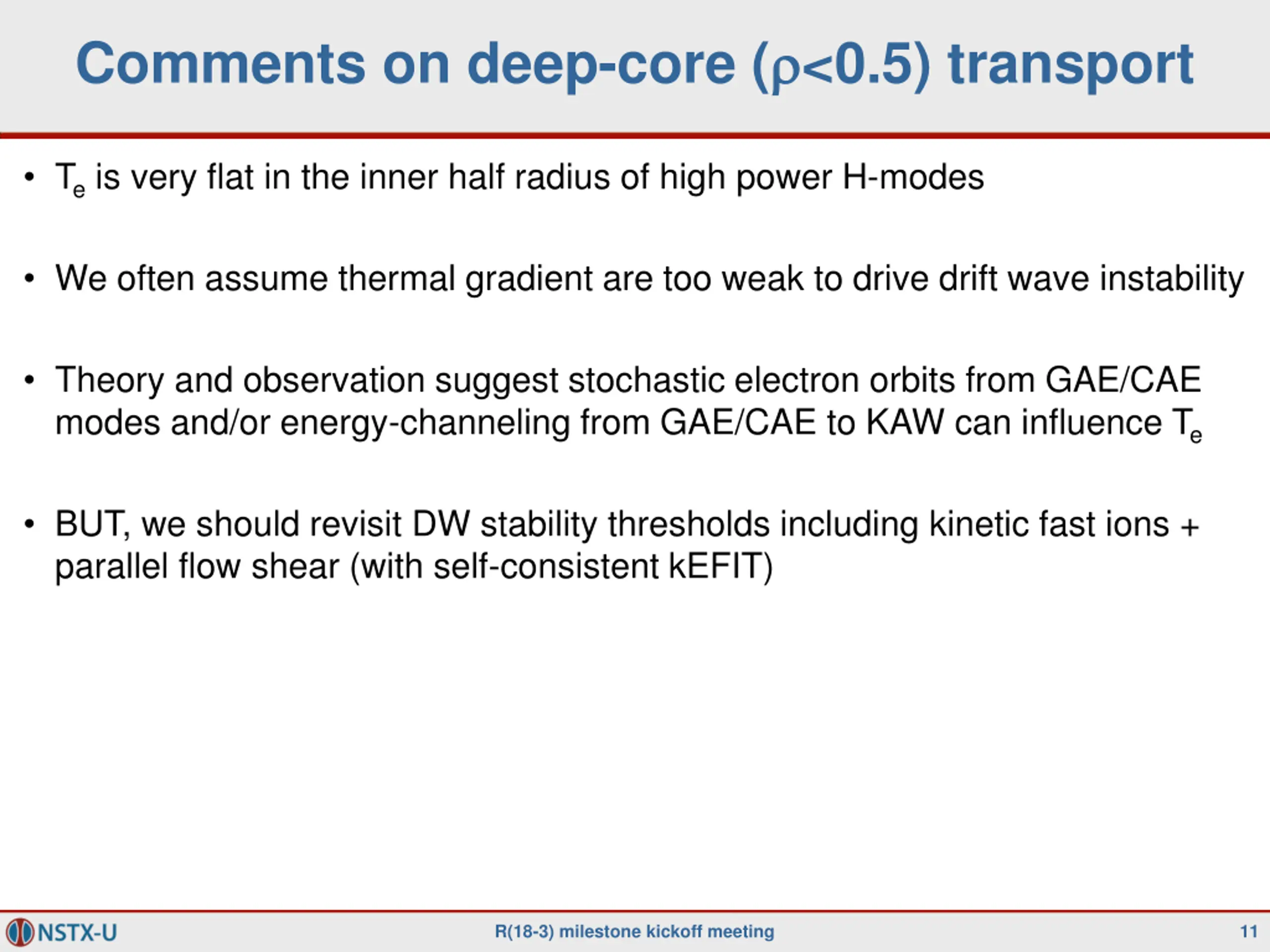 Comments on deep-core ( <0.5) transport Te is very flat in the inner half radius of high power H-modes We often assume thermal gradient are too weak to drive drift wave instability Theory and observation suggest stochastic electron orbits from GAE/CAE modes and/or energy-channeling from GAE/CAE to KAW can influence Te BUT, we should revisit DW stability thresholds including kinetic fast ions + parallel flow shear (with self-consistent kEFIT) R(18-3) milestone kickoff meeting 11