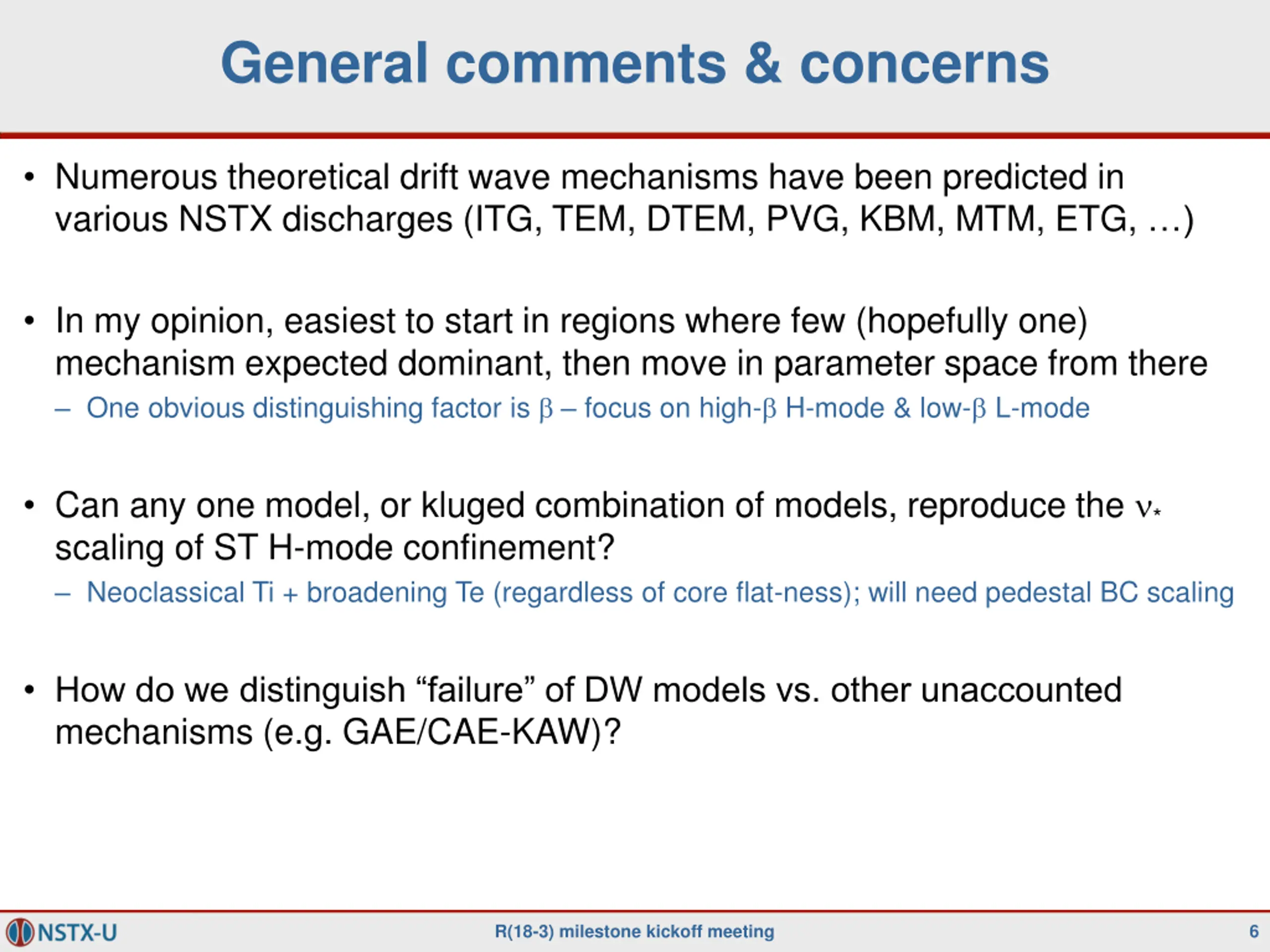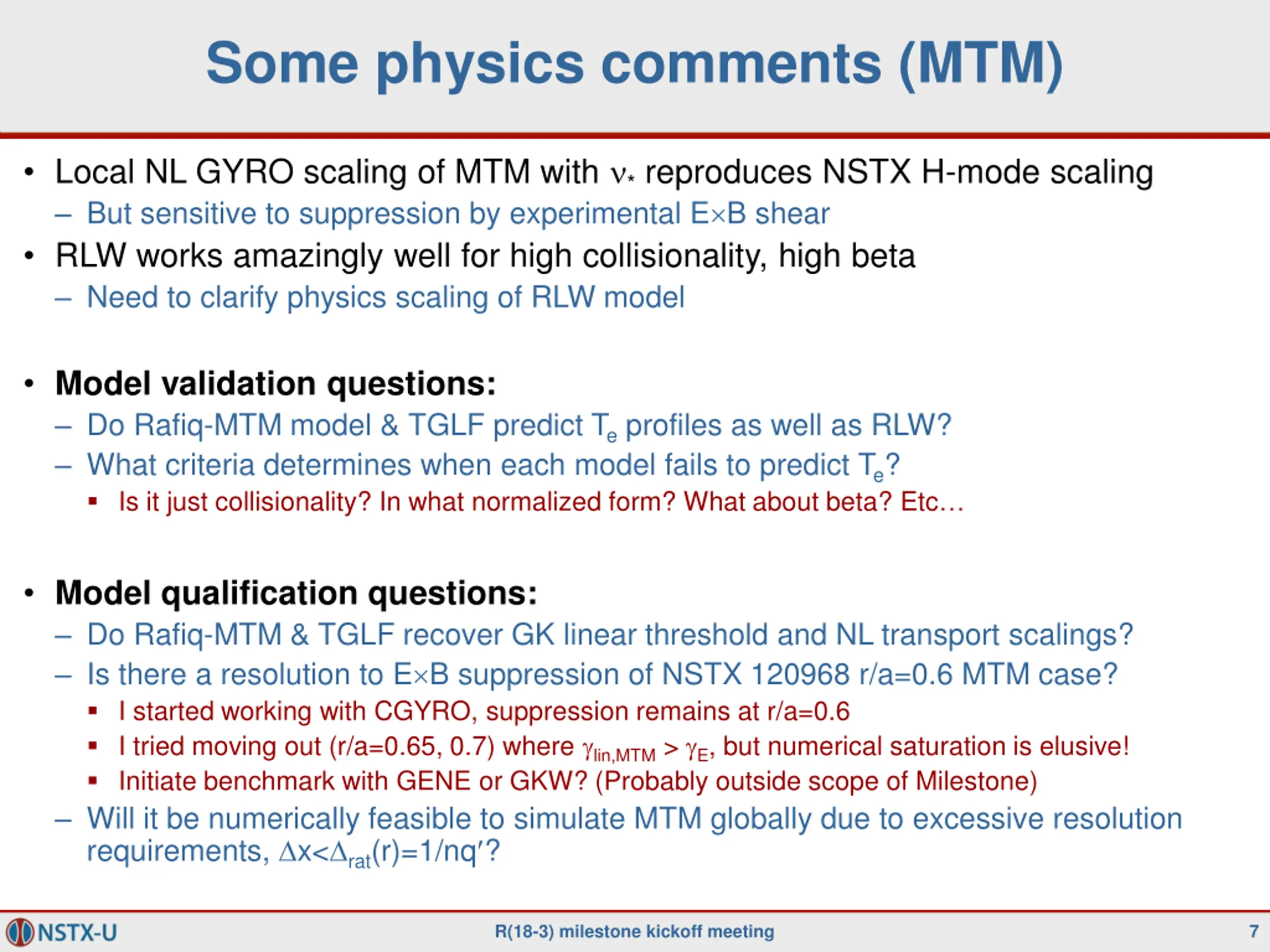 General comments & concerns Numerous theoretical drift wave mechanisms have been predicted in various NSTX discharges (ITG, TEM, DTEM, PVG, KBM, MTM, ETG, ) In my opinion, easiest to start in regions where few (hopefully one) mechanism expected dominant, then move in parameter space from there One obvious distinguishing factor is focus on high- H-mode & low- L-mode Can any one model, or kluged combination of models, reproduce the * scaling of ST H-mode confinement? Neoclassical Ti + broadening Te (regardless of core flat-ness); will need pedestal BC scaling How do we distinguish failure of DW models vs. other unaccounted mechanisms (e.g. GAE/CAE-KAW)? R(18-3) milestone kickoff meeting 6