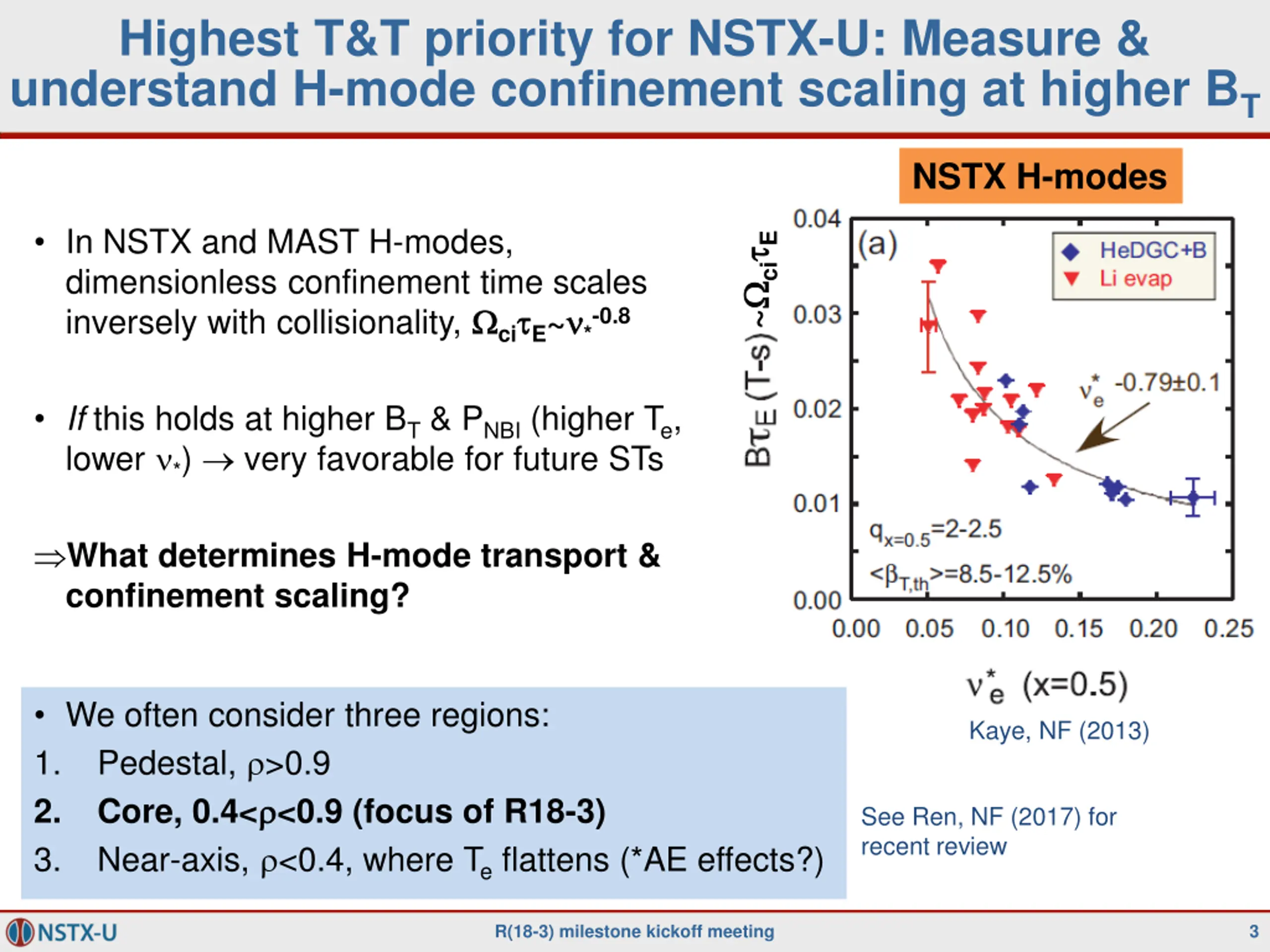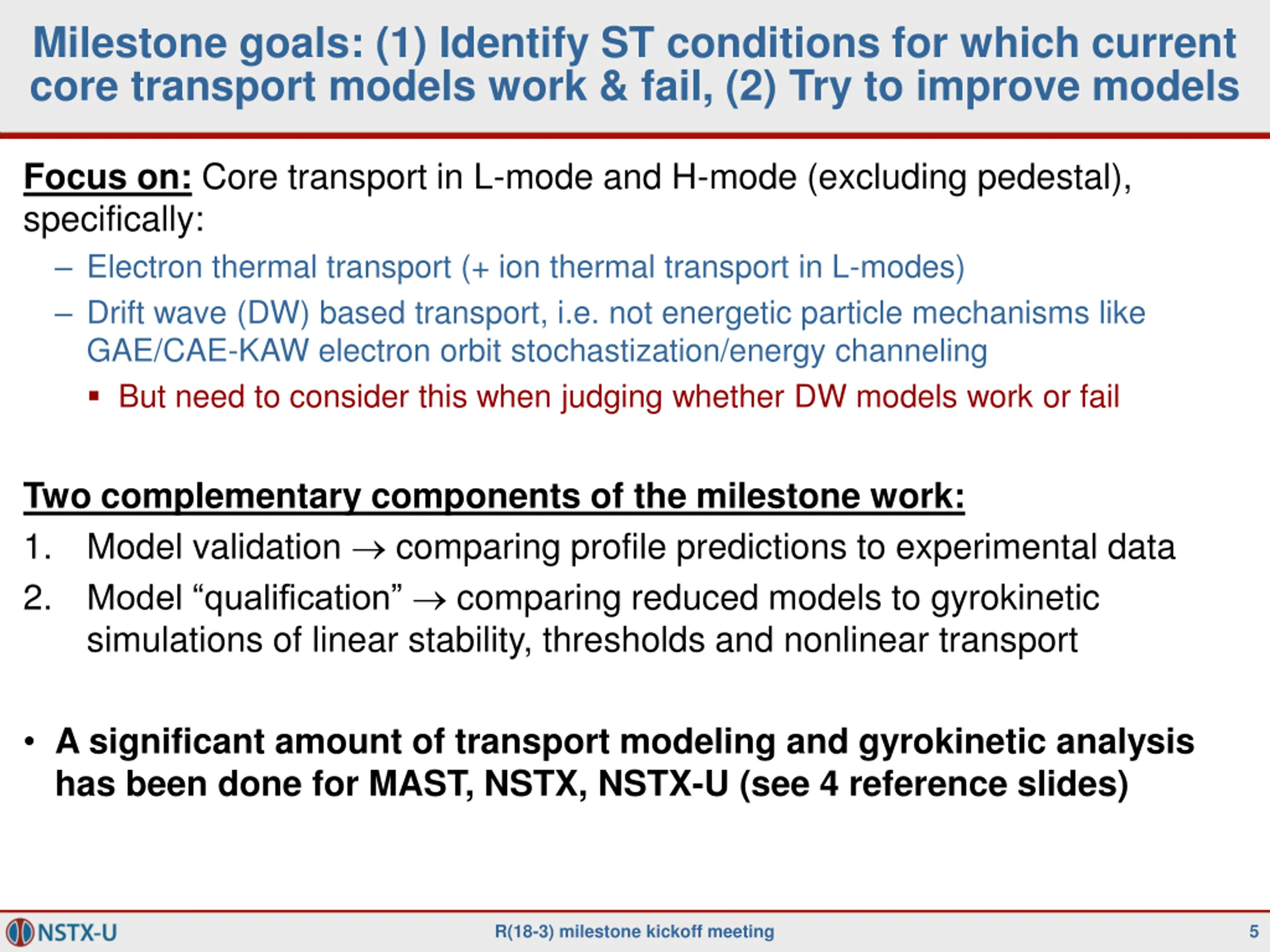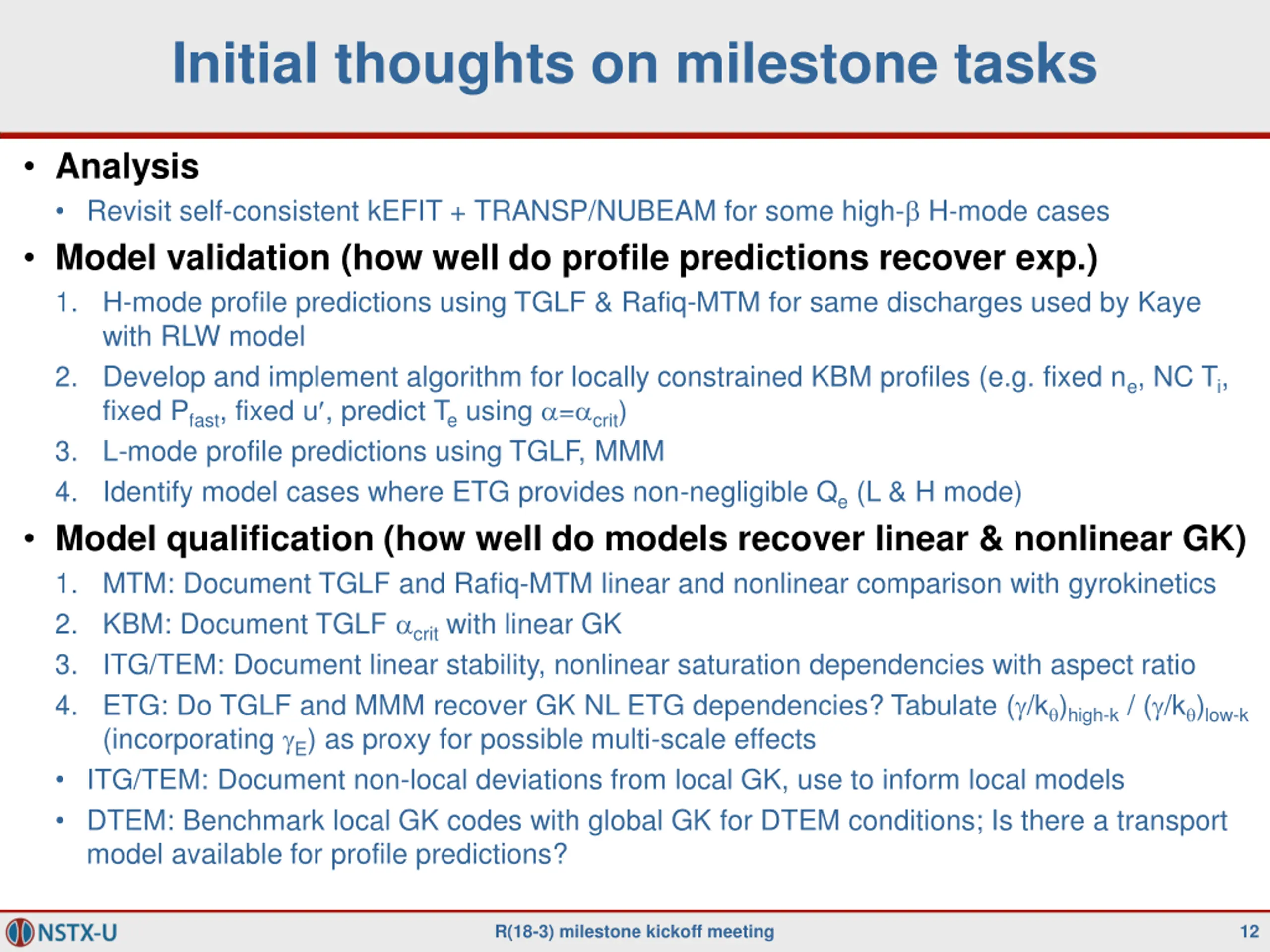 R18-3: Validate and further develop reduced transport models for electron thermal transport in ST plasmas http://nstx-u.pppl.gov/program/milestones/fy2018-research The design of next generation spherical tori (STs) will be influenced by the scaling of energy confinement. While ion thermal transport is often near neoclassical levels in H-modes in ST plasmas, gyro-kinetic simulations have indicated a number of potential drift wave turbulence mechanisms that can influence electron thermal transport. Reduced transport models that capture the key physics and scaling of the computationally expensive first-principles gyro-kinetic simulations are required to more thoroughly validate the modeling against experimental data, which can then be used to infer the key physics that determines the overall energy confinement. A variety of reduced transport models based on drift wave turbulence have been developed and tested extensively for conventional tokamaks. These models encompass much of the physics expected to be important in STs, although they have been tested much less rigorously for ST parameters (low aspect ratio, high beta, strong flow). In order to improve the fidelity of reduced transport models (like TGLF, RLW and MMM), experimental NSTX, MAST and NSTX-U data will be used to examine predictions based on these models to assess their suitability for ST plasma. The physics accuracy of these fluid-based models will be also be qualified by comparing directly to first-principles gyro-kinetic simulations over a range of conditions. The dependence of electrostatic ITG and TEM instabilities on aspect ratio will be evaluated by comparing L-mode cases to established conventional aspect ratio conditions. Validation with high beta H-mode data will push the limits of the available reduced models to recover electromagnetic instabilities like MTM and KBM. A key outcome of this milestone will be to determine the ST physics regimes in which further model development is required. The first-principles gyro-kinetic simulations based on ST parameters will form the basis for enhancements of the TGLF reduced model. R(18-3) milestone kickoff meeting 2
