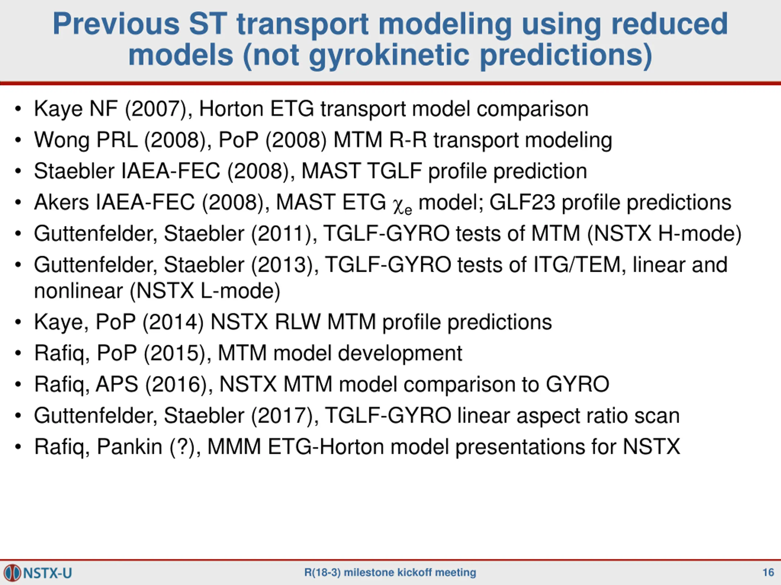 Previous ST transport modeling using reduced models (not gyrokinetic predictions) Kaye NF (2007), Horton ETG transport model comparison Wong PRL (2008), PoP (2008) MTM R-R transport modeling Staebler IAEA-FEC (2008), MAST TGLF profile prediction Akers IAEA-FEC (2008), MAST ETG e model; GLF23 profile predictions Guttenfelder, Staebler (2011), TGLF-GYRO tests of MTM (NSTX H-mode) Guttenfelder, Staebler (2013), TGLF-GYRO tests of ITG/TEM, linear and nonlinear (NSTX L-mode) Kaye, PoP (2014) NSTX RLW MTM profile predictions Rafiq, PoP (2015), MTM model development Rafiq, APS (2016), NSTX MTM model comparison to GYRO Guttenfelder, Staebler (2017), TGLF-GYRO linear aspect ratio scan Rafiq, Pankin (?), MMM ETG-Horton model presentations for NSTX R(18-3) milestone kickoff meeting 16