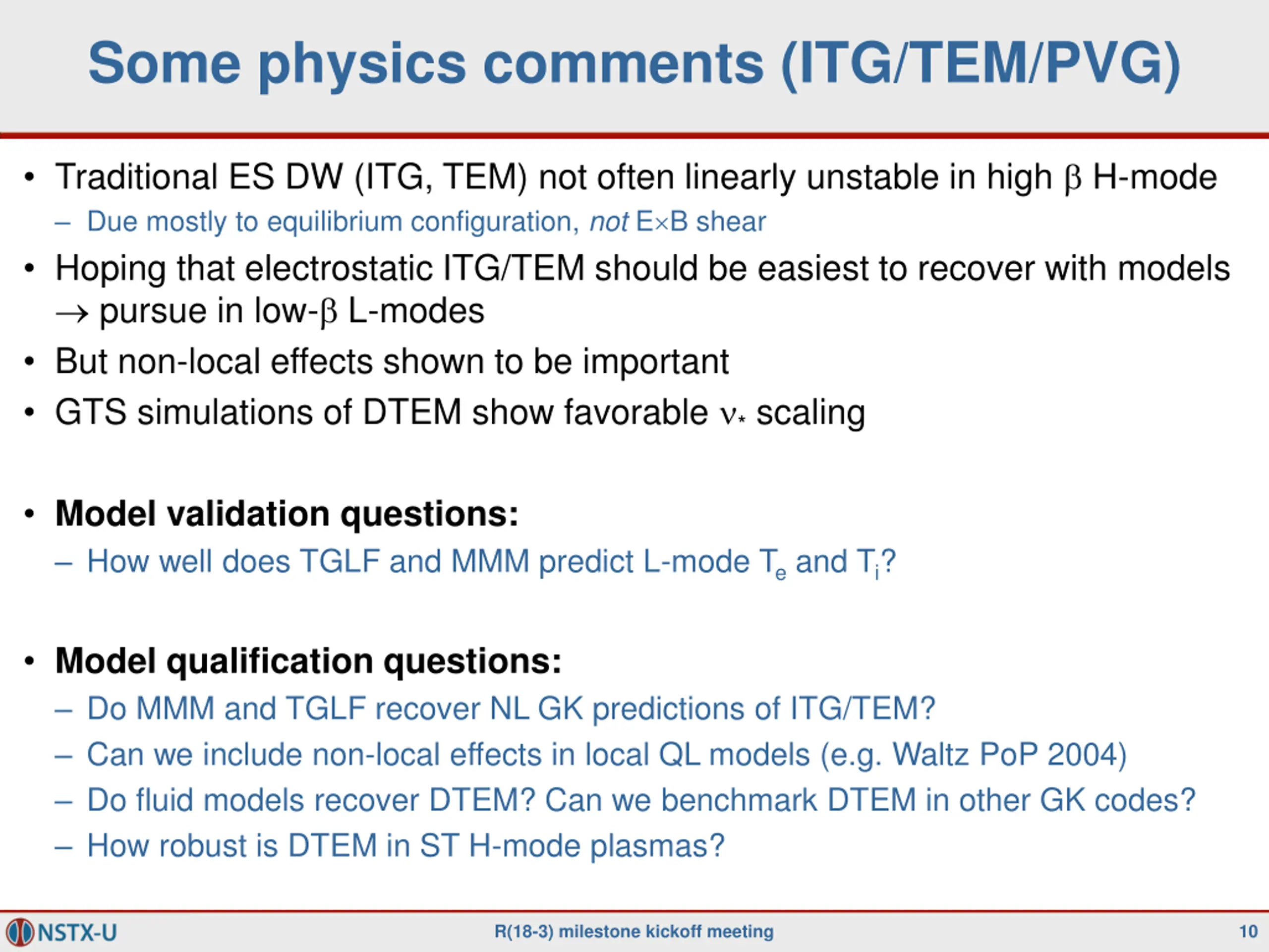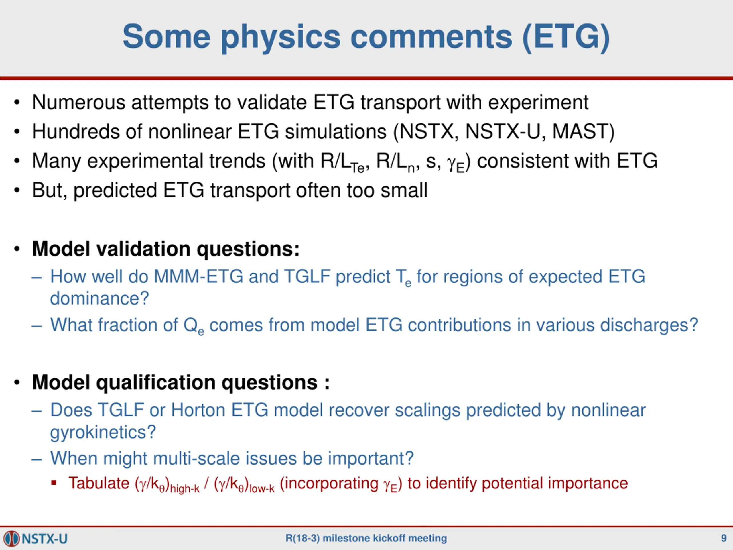 Some physics comments (ETG) Numerous attempts to validate ETG transport with experiment Hundreds of nonlinear ETG simulations (NSTX, NSTX-U, MAST) Many experimental trends (with R/LTe, R/Ln, s, E) consistent with ETG But, predicted ETG transport often too small Model validation questions: How well do MMM-ETG and TGLF predict Te for regions of expected ETG dominance? What fraction of Qe comes from model ETG contributions in various discharges? Model qualification questions : Does TGLF or Horton ETG model recover scalings predicted by nonlinear gyrokinetics? When might multi-scale issues be important? Tabulate ( /k )high-k / ( /k )low-k (incorporating E) to identify potential importance R(18-3) milestone kickoff meeting 9