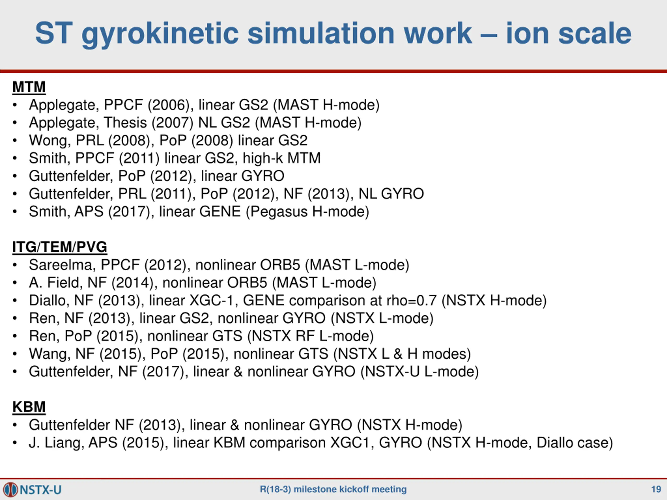 ST gyrokinetic simulation work ion scale MTM Applegate, PPCF (2006), linear GS2 (MAST H-mode) Applegate, Thesis (2007) NL GS2 (MAST H-mode) Wong, PRL (2008), PoP (2008) linear GS2 Smith, PPCF (2011) linear GS2, high-k MTM Guttenfelder, PoP (2012), linear GYRO Guttenfelder, PRL (2011), PoP (2012), NF (2013), NL GYRO Smith, APS (2017), linear GENE (Pegasus H-mode) ITG/TEM/PVG Sareelma, PPCF (2012), nonlinear ORB5 (MAST L-mode) A. Field, NF (2014), nonlinear ORB5 (MAST L-mode) Diallo, NF (2013), linear XGC-1, GENE comparison at rho=0.7 (NSTX H-mode) Ren, NF (2013), linear GS2, nonlinear GYRO (NSTX L-mode) Ren, PoP (2015), nonlinear GTS (NSTX RF L-mode) Wang, NF (2015), PoP (2015), nonlinear GTS (NSTX L & H modes) Guttenfelder, NF (2017), linear & nonlinear GYRO (NSTX-U L-mode) KBM Guttenfelder NF (2013), linear & nonlinear GYRO (NSTX H-mode) J. Liang, APS (2015), linear KBM comparison XGC1, GYRO (NSTX H-mode, Diallo case) R(18-3) milestone kickoff meeting 19