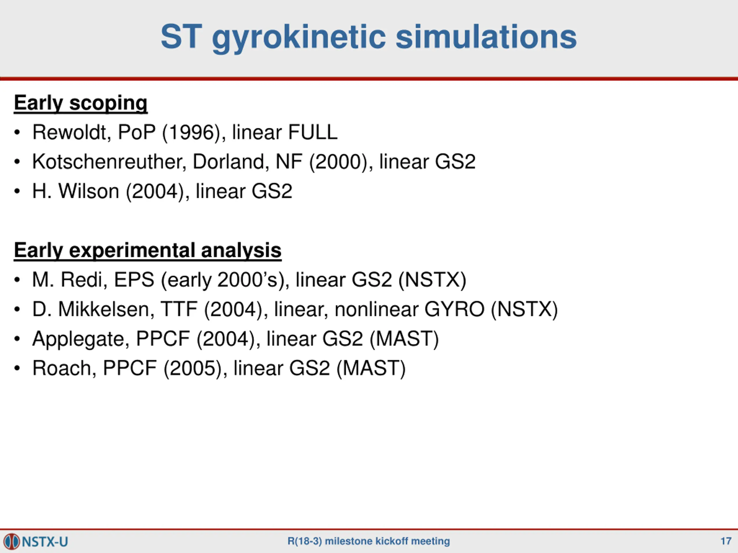 ST gyrokinetic simulations Early scoping Rewoldt, PoP (1996), linear FULL Kotschenreuther, Dorland, NF (2000), linear GS2 H. Wilson (2004), linear GS2 Early experimental analysis M. Redi, EPS (early 2000 s), linear GS2 (NSTX) D. Mikkelsen, TTF (2004), linear, nonlinear GYRO (NSTX) Applegate, PPCF (2004), linear GS2 (MAST) Roach, PPCF (2005), linear GS2 (MAST) R(18-3) milestone kickoff meeting 17