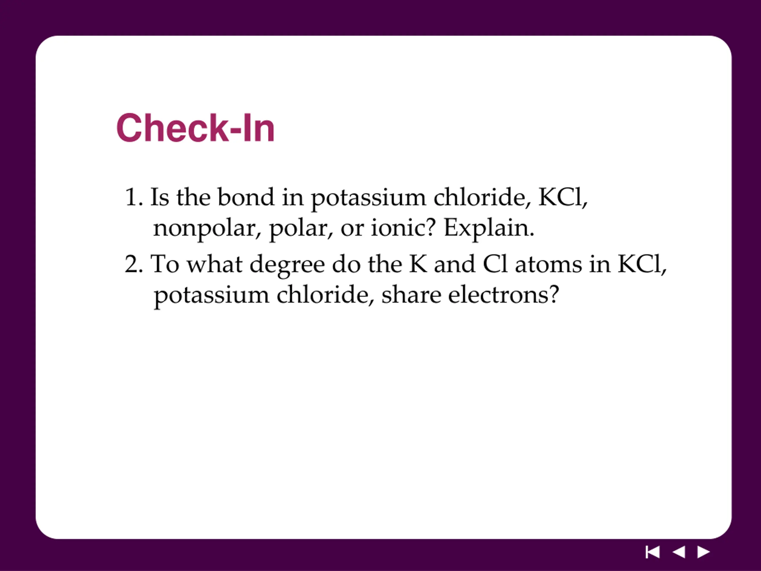 Check-In 1. Is the bond in potassium chloride, KCl, nonpolar, polar, or ionic? Explain. 2. To what degree do the K and Cl atoms in KCl, potassium chloride, share electrons?