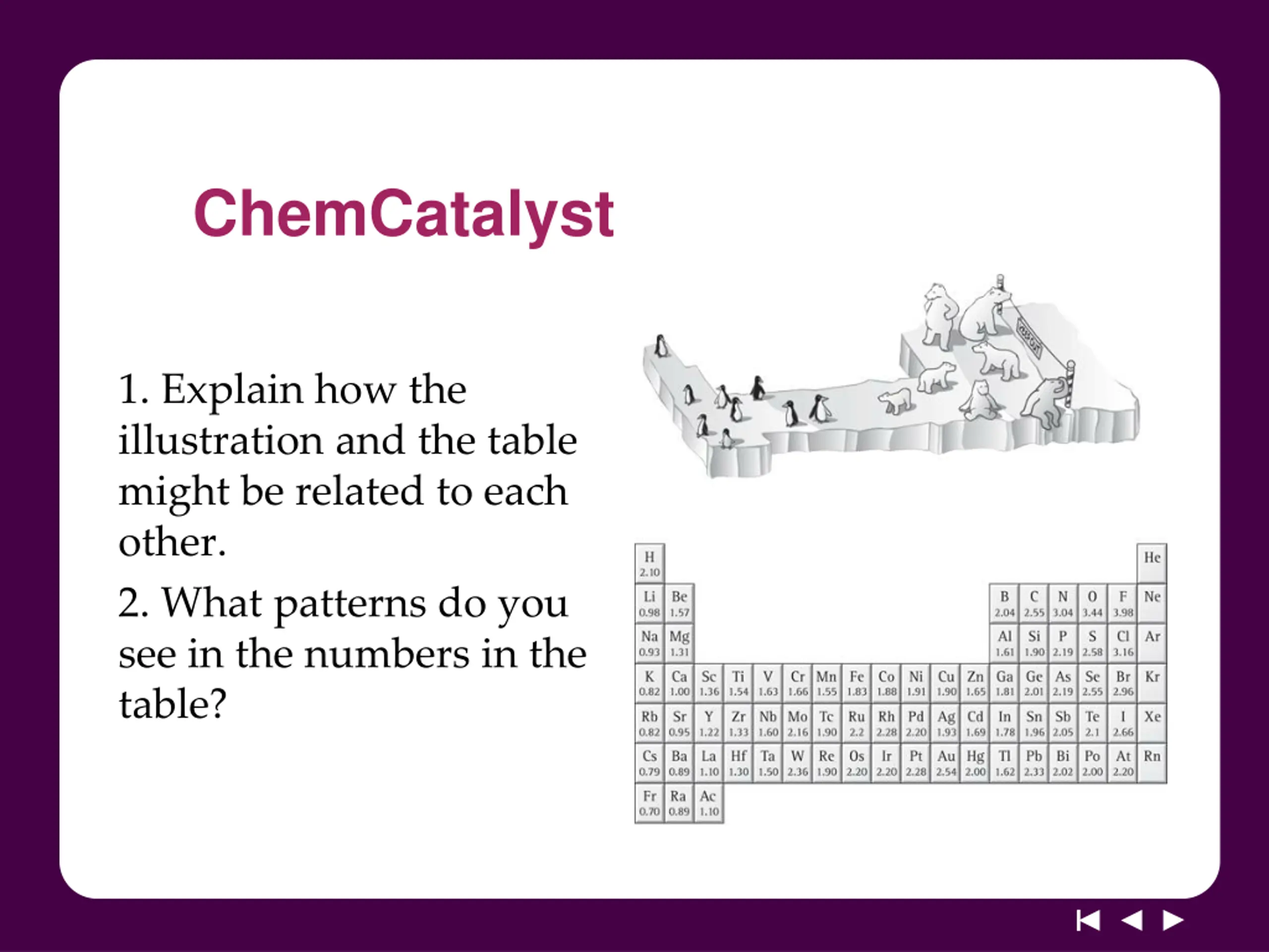 ChemCatalyst 1. Explain how the illustration and the table might be related to each other. 2. What patterns do you see in the numbers in the table?