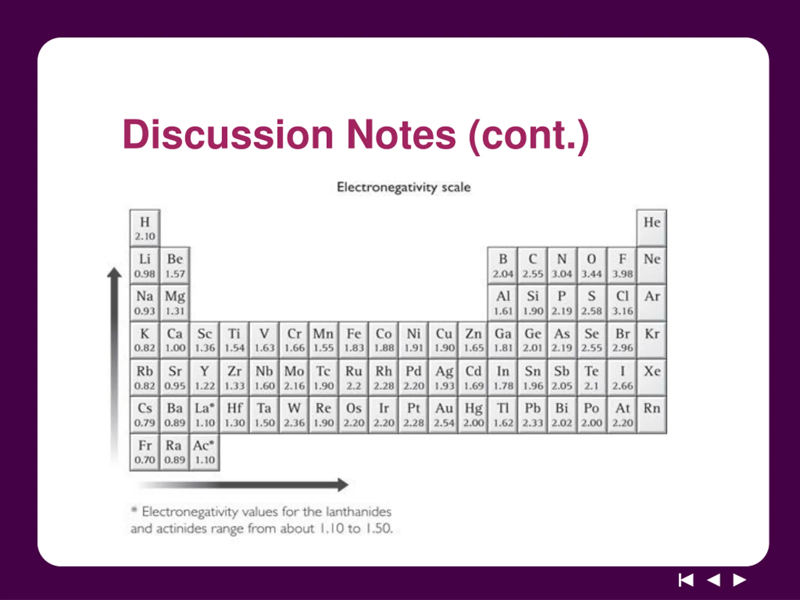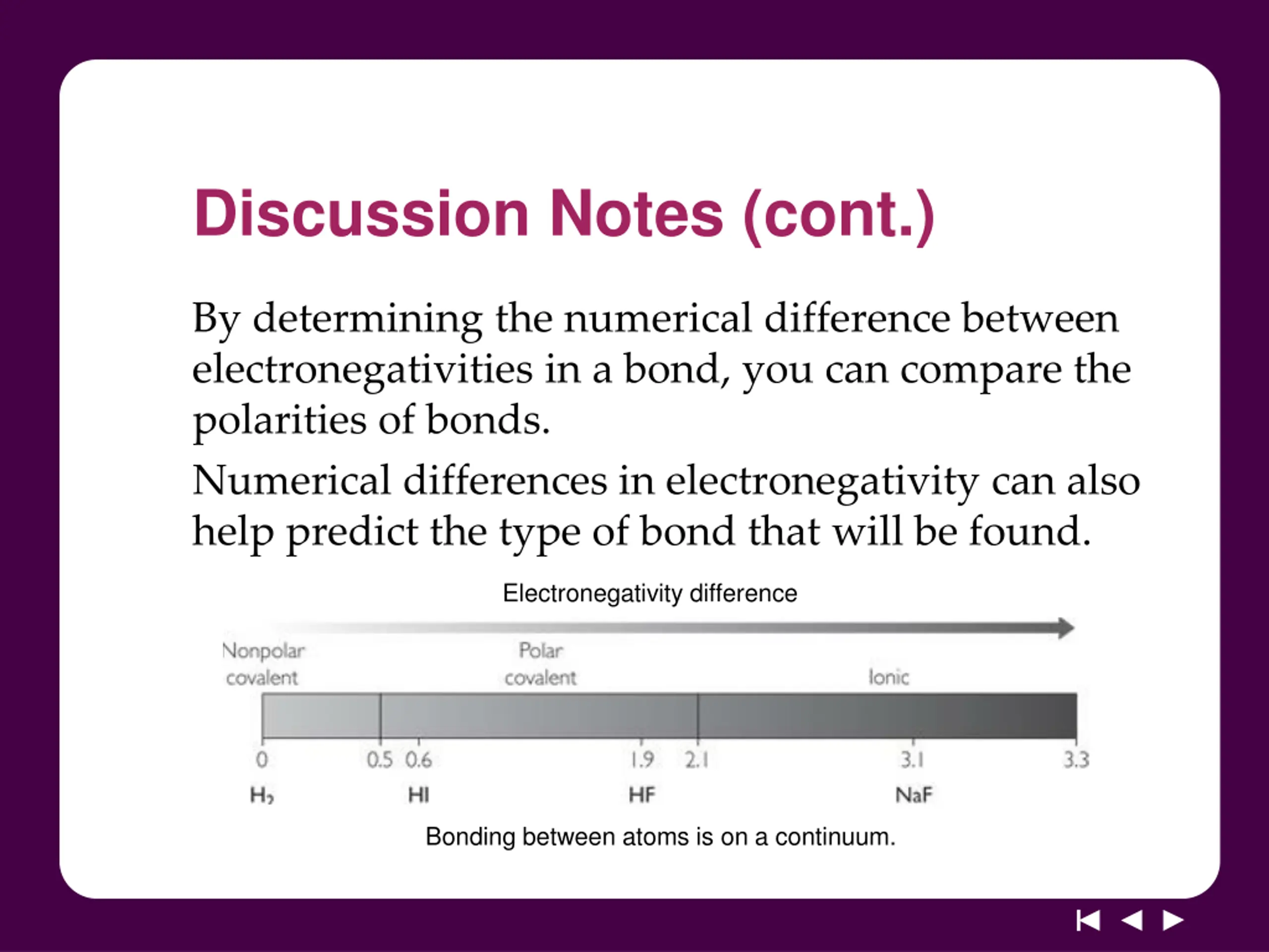 Discussion Notes (cont.) By determining the numerical difference between electronegativities in a bond, you can compare the polarities of bonds. Numerical differences in electronegativity can also help predict the type of bond that will be found. Electronegativity difference Bonding between atoms is on a continuum.