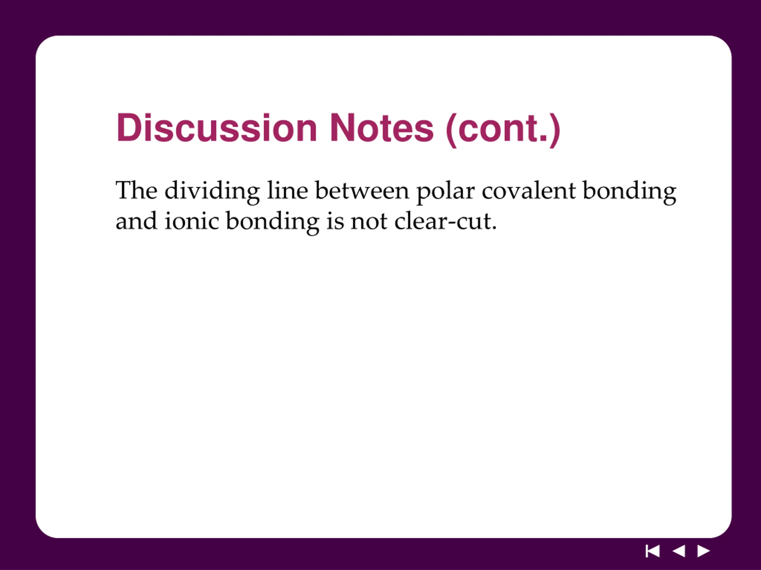 Discussion Notes (cont.) The dividing line between polar covalent bonding and ionic bonding is not clear-cut.