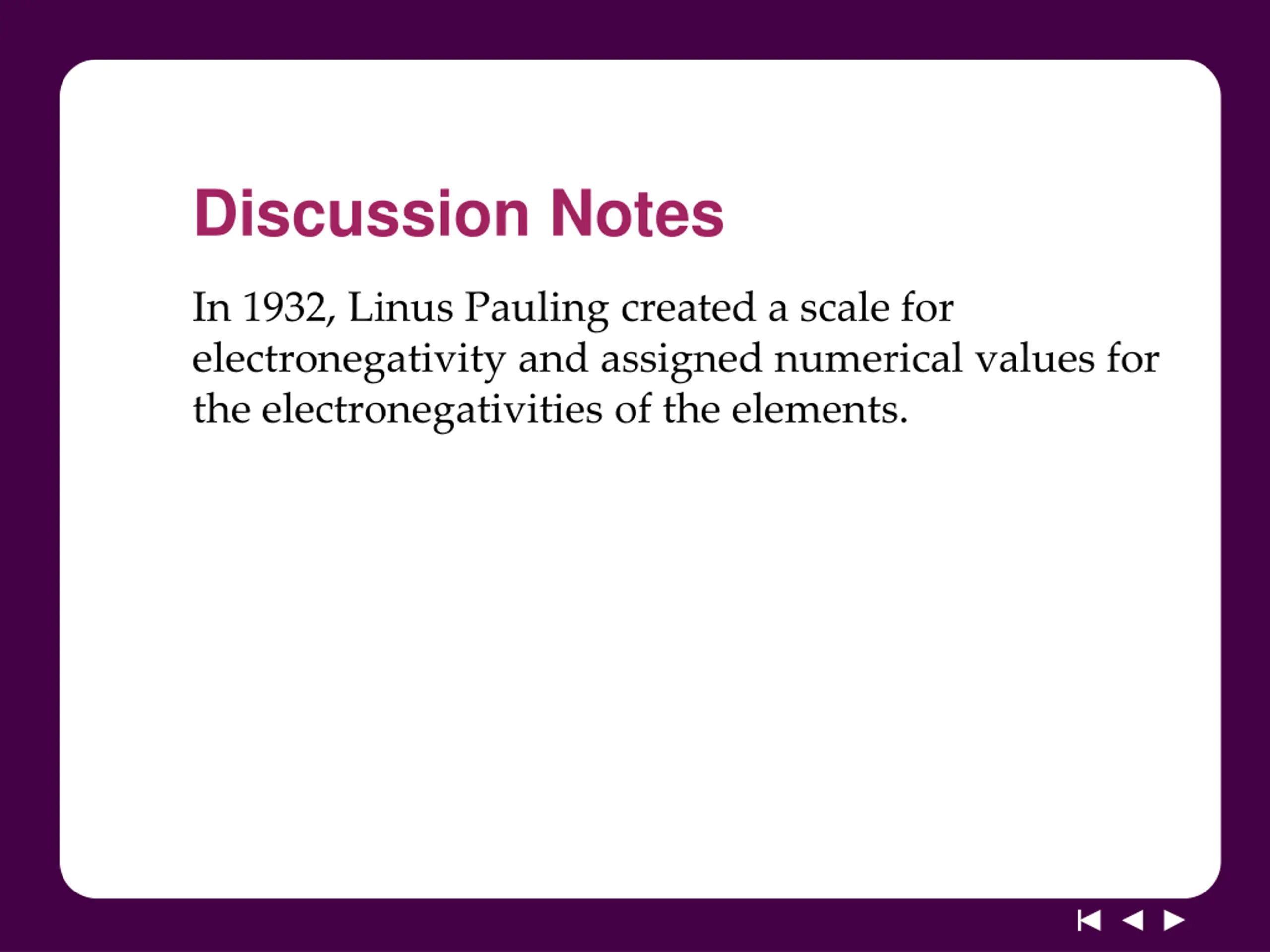 Discussion Notes In 1932, Linus Pauling created a scale for electronegativity and assigned numerical values for the electronegativities of the elements.