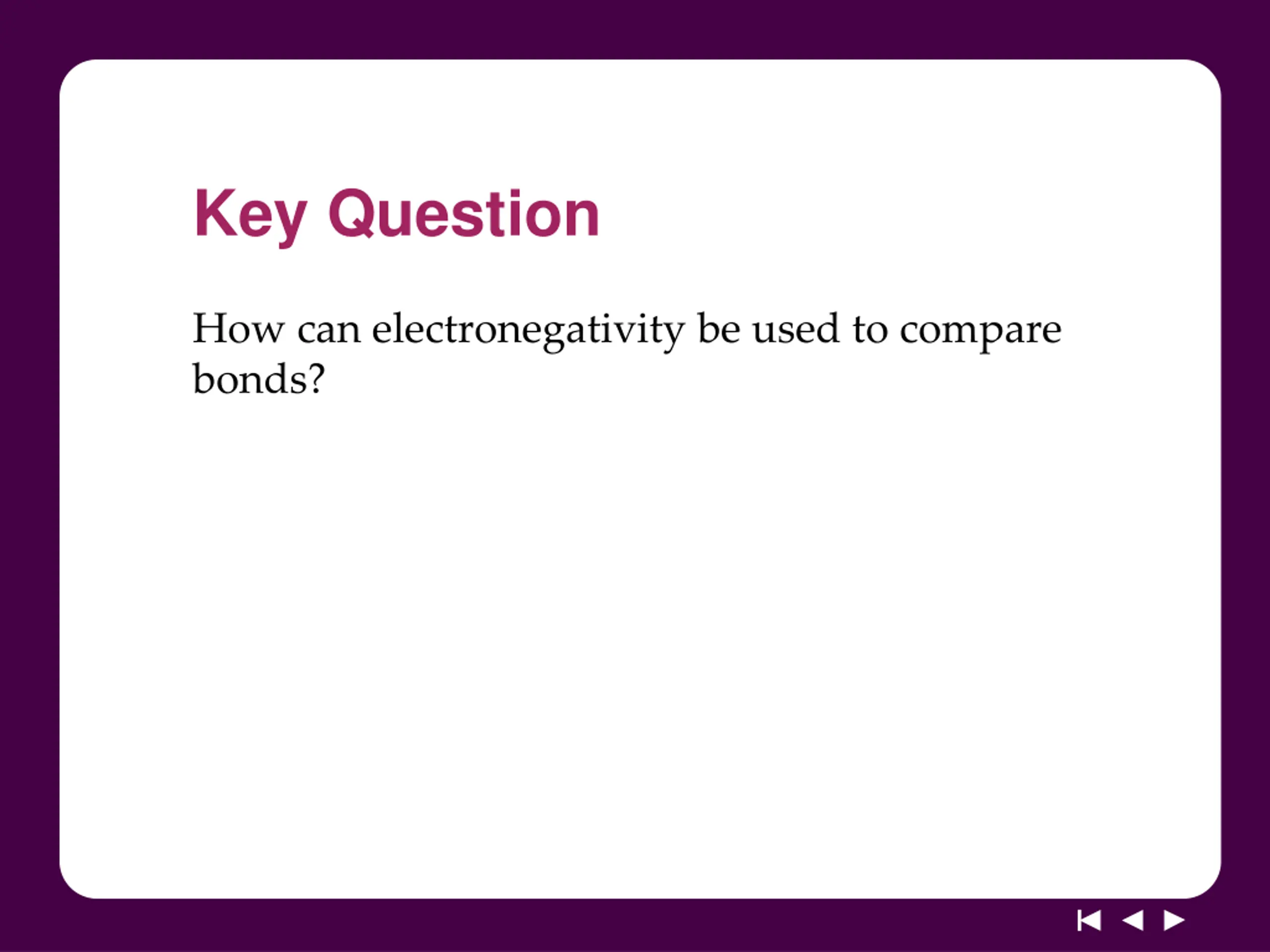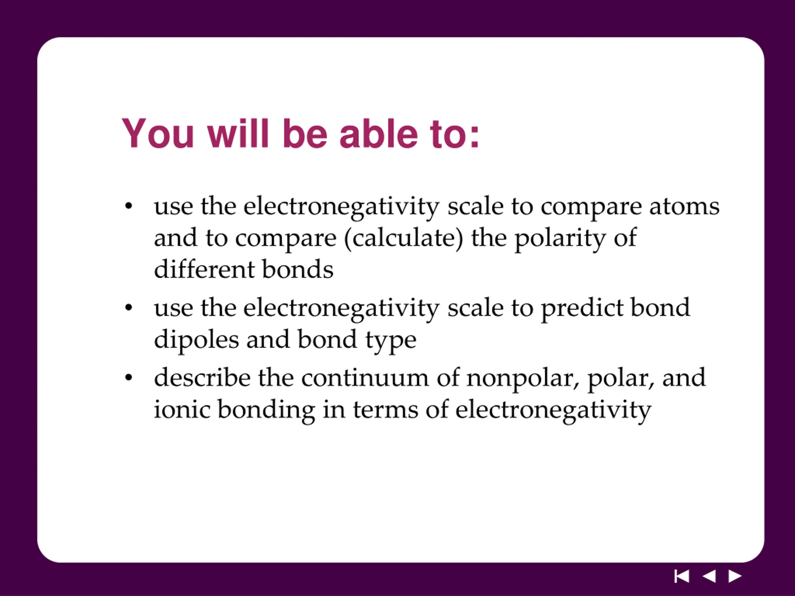 You will be able to: use the electronegativity scale to compare atoms and to compare (calculate) the polarity of different bonds use the electronegativity scale to predict bond dipoles and bond type describe the continuum of nonpolar, polar, and ionic bonding in terms of electronegativity
