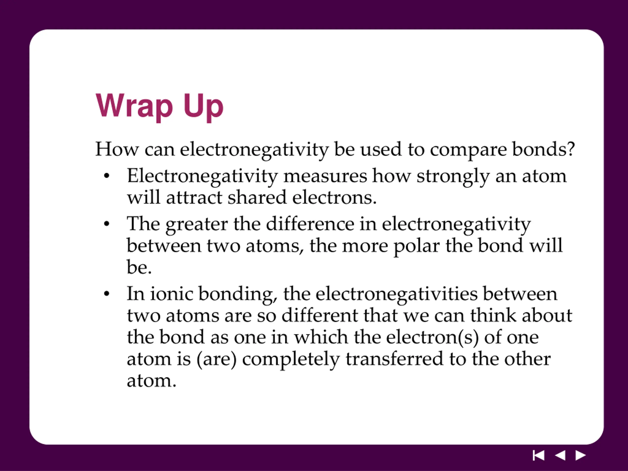Wrap Up How can electronegativity be used to compare bonds? Electronegativity measures how strongly an atom will attract shared electrons. The greater the difference in electronegativity between two atoms, the more polar the bond will be. In ionic bonding, the electronegativities between two atoms are so different that we can think about the bond as one in which the electron(s) of one atom is (are) completely transferred to the other atom.