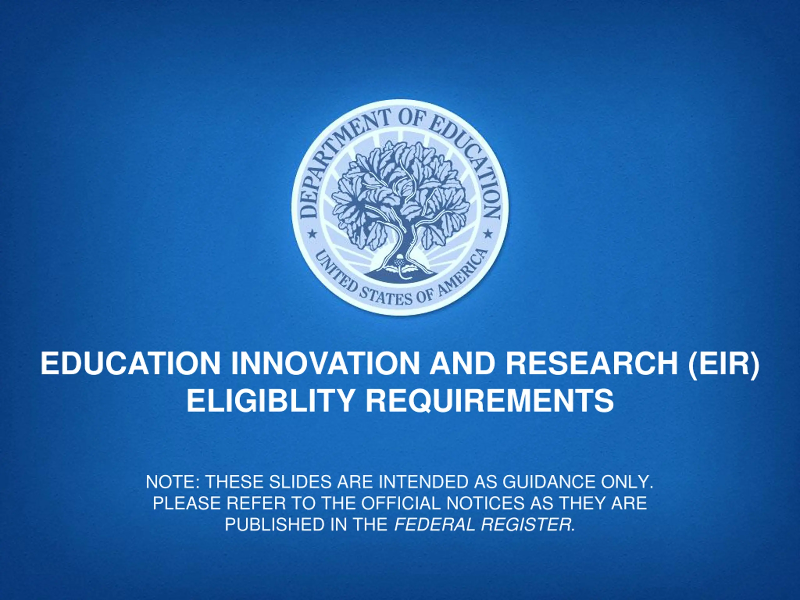 EDUCATION INNOVATION AND RESEARCH (EIR) ELIGIBLITY REQUIREMENTS NOTE: THESE SLIDES ARE INTENDED AS GUIDANCE ONLY. PLEASE REFER TO THE OFFICIAL NOTICES AS THEY ARE PUBLISHED IN THE FEDERAL REGISTER.