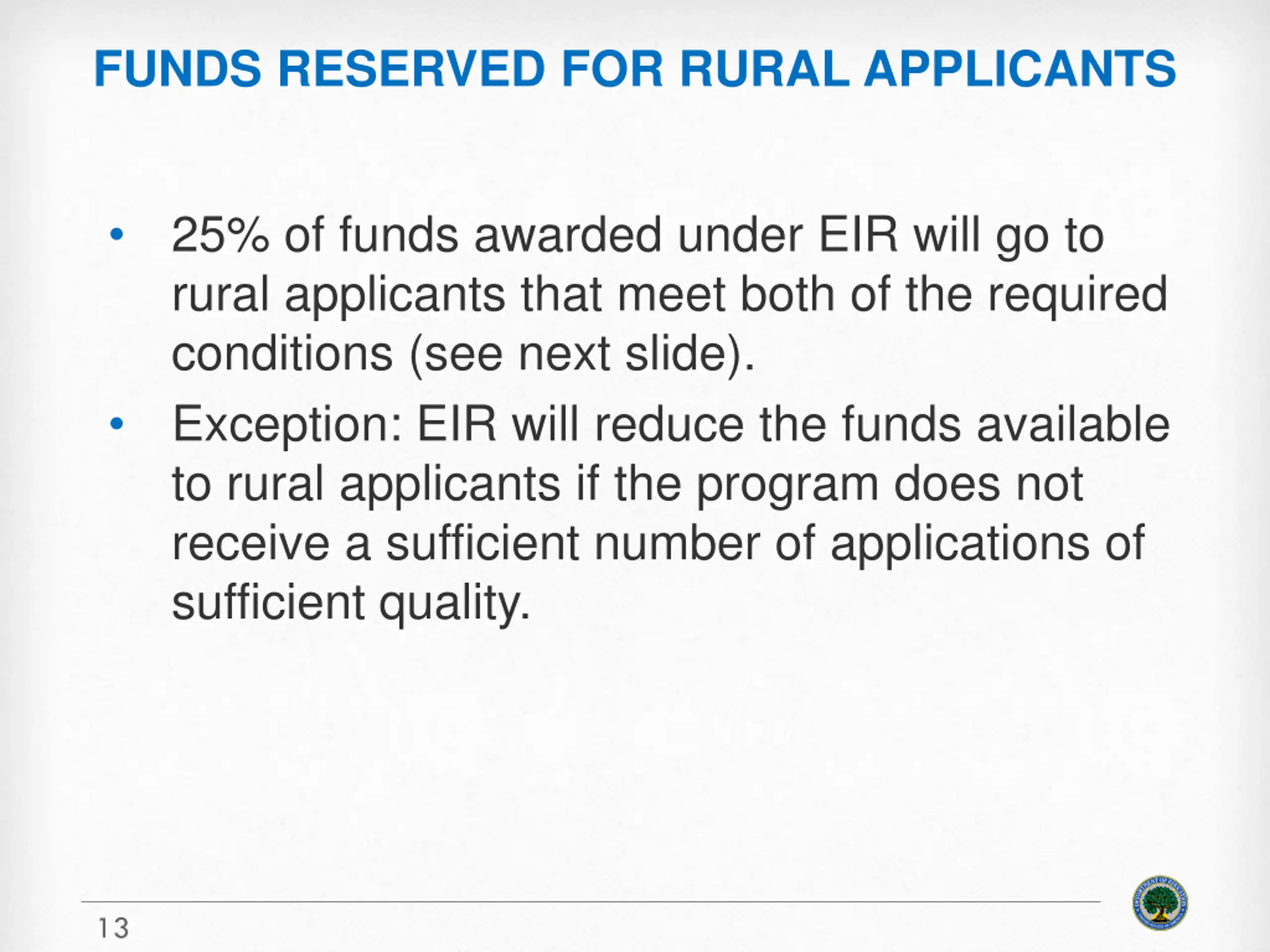 FUNDS RESERVED FOR RURAL APPLICANTS 25% of funds awarded under EIR will go to rural applicants that meet both of the required conditions (see next slide). Exception: EIR will reduce the funds available to rural applicants if the program does not receive a sufficient number of applications of sufficient quality. 13