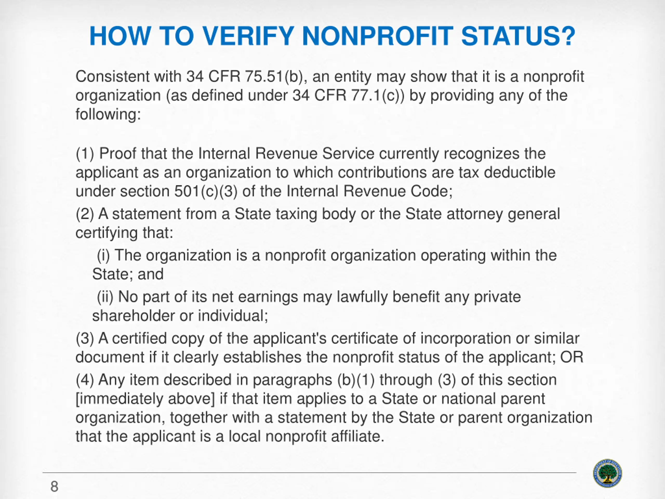 HOW TO VERIFY NONPROFIT STATUS? Consistent with 34 CFR 75.51(b), an entity may show that it is a nonprofit organization (as defined under 34 CFR 77.1(c)) by providing any of the following: (1) Proof that the Internal Revenue Service currently recognizes the applicant as an organization to which contributions are tax deductible under section 501(c)(3) of the Internal Revenue Code; (2) A statement from a State taxing body or the State attorney general certifying that: (i) The organization is a nonprofit organization operating within the State; and (ii) No part of its net earnings may lawfully benefit any private shareholder or individual; (3) A certified copy of the applicant's certificate of incorporation or similar document if it clearly establishes the nonprofit status of the applicant; OR (4) Any item described in paragraphs (b)(1) through (3) of this section [immediately above] if that item applies to a State or national parent organization, together with a statement by the State or parent organization that the applicant is a local nonprofit affiliate. 8
