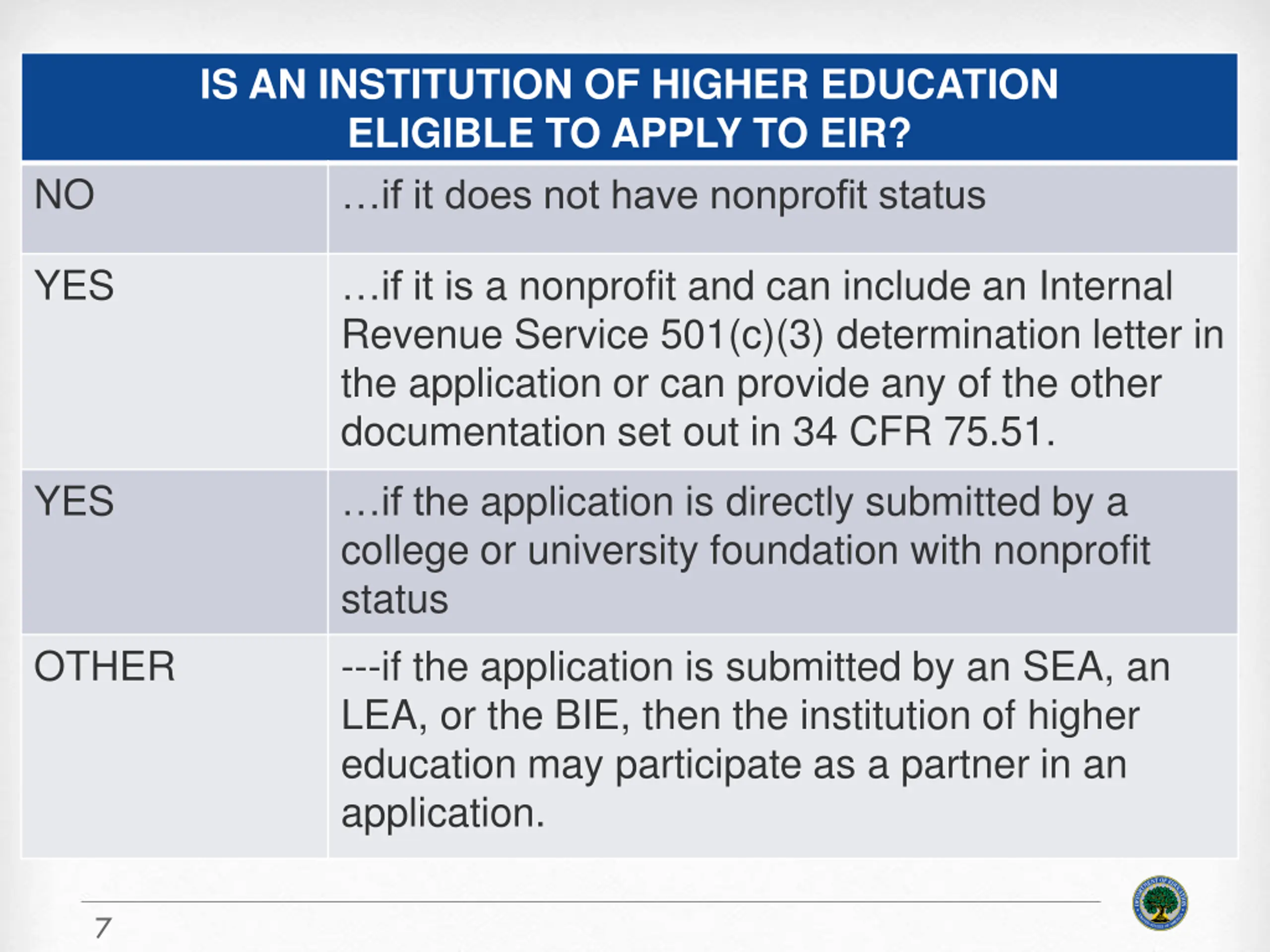 IS AN INSTITUTION OF HIGHER EDUCATION ELIGIBLE TO APPLY TO EIR? if it does not have nonprofit status NO YES if it is a nonprofit and can include an Internal Revenue Service 501(c)(3) determination letter in the application or can provide any of the other documentation set out in 34 CFR 75.51. YES if the application is directly submitted by a college or university foundation with nonprofit status ---if the application is submitted by an SEA, an LEA, or the BIE, then the institution of higher education may participate as a partner in an application. OTHER 7