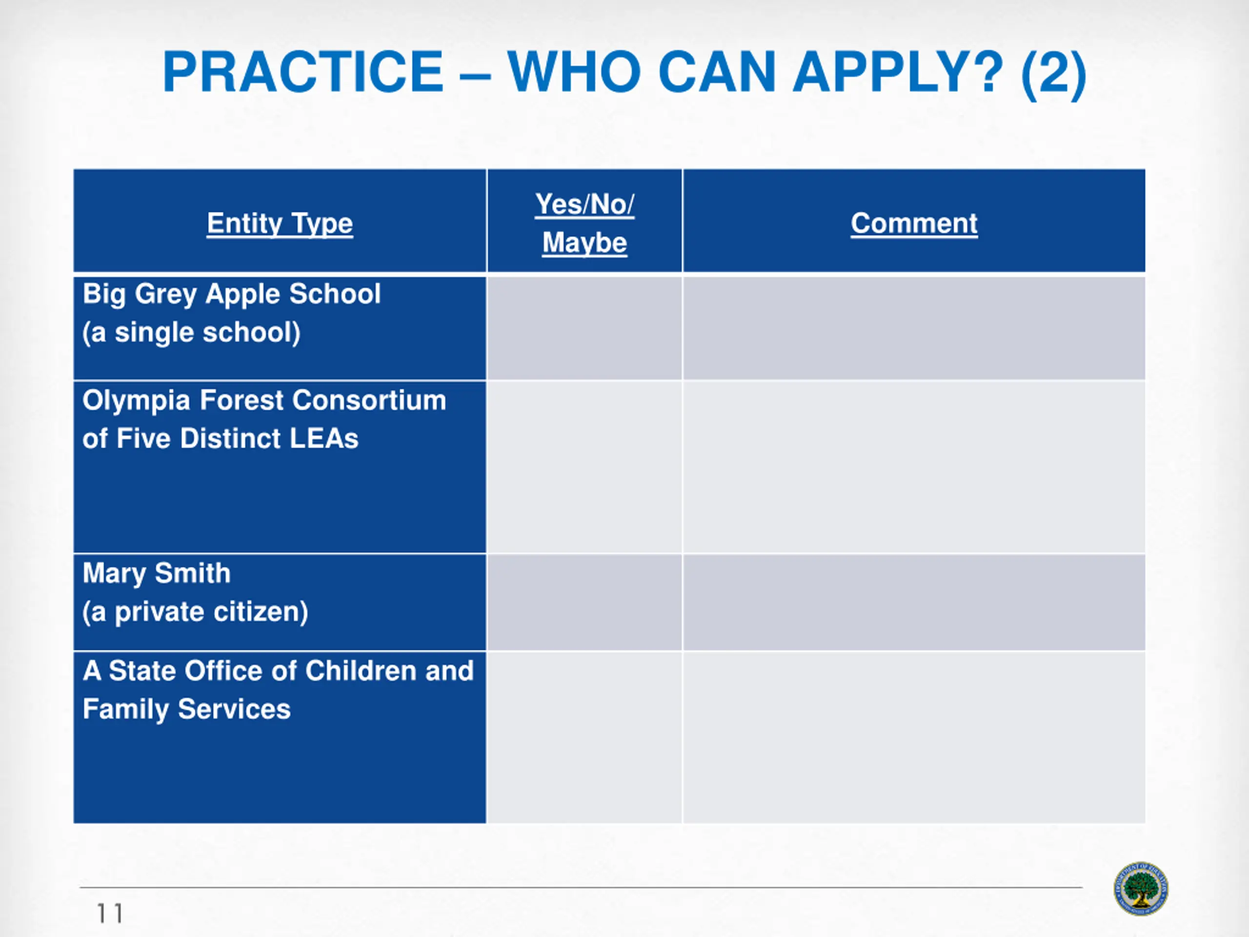 PRACTICE WHO CAN APPLY? (2-ANSWERS) Yes/No/ Maybe Entity Type Comment Big Grey Apple School (a single school) LEAs may apply, but not individual schools. No Olympia Forest Consortium of Five Distinct LEAs One LEA in the consortium will need to serve as the lead applicant. Yes Mary Smith (a private citizen) No Individuals are not eligible entities. A State Office of Children and Family Services SEAs may apply, but not other State agency offices. No 12