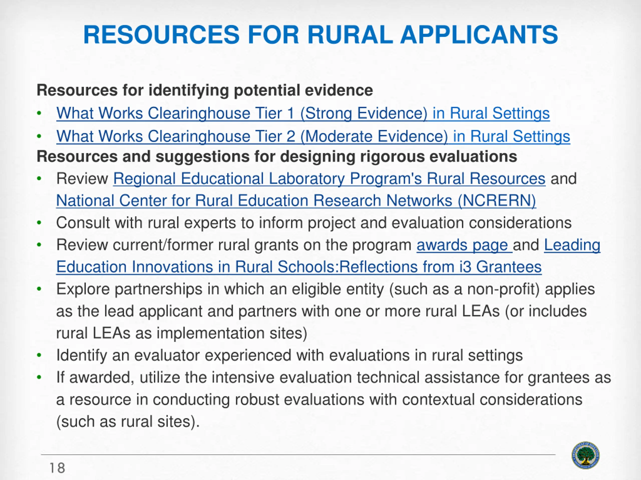 RESOURCES FOR RURAL APPLICANTS Resources for identifying potential evidence What Works Clearinghouse Tier 1 (Strong Evidence) in Rural Settings What Works Clearinghouse Tier 2 (Moderate Evidence) in Rural Settings Resources and suggestions for designing rigorous evaluations Review Regional Educational Laboratory Program's Rural Resources and National Center for Rural Education Research Networks (NCRERN) Consult with rural experts to inform project and evaluation considerations Review current/former rural grants on the program awards page and Leading Education Innovations in Rural Schools:Reflections from i3 Grantees Explore partnerships in which an eligible entity (such as a non-profit) applies as the lead applicant and partners with one or more rural LEAs (or includes rural LEAs as implementation sites) Identify an evaluator experienced with evaluations in rural settings If awarded, utilize the intensive evaluation technical assistance for grantees as a resource in conducting robust evaluations with contextual considerations (such as rural sites). 18