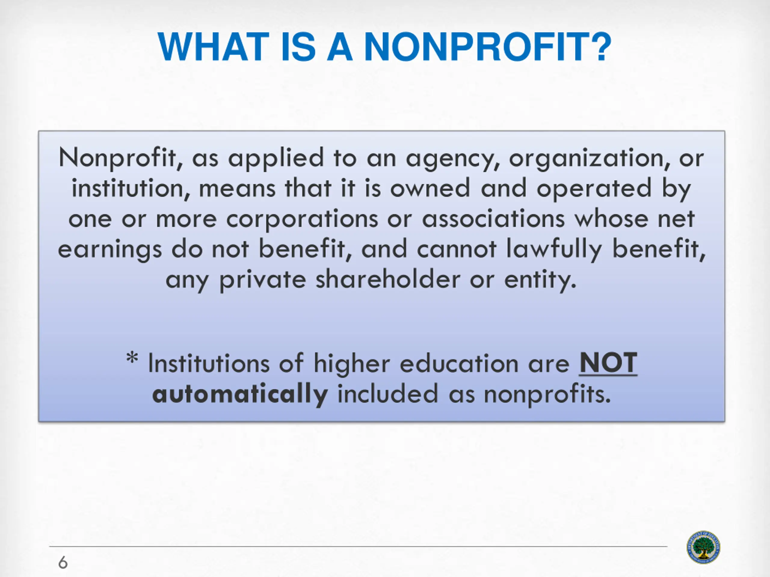 WHAT IS A NONPROFIT? Nonprofit, as applied to an agency, organization, or institution, means that it is owned and operated by one or more corporations or associations whose net earnings do not benefit, and cannot lawfully benefit, any private shareholder or entity. * Institutions of higher education are NOT automatically included as nonprofits. 6