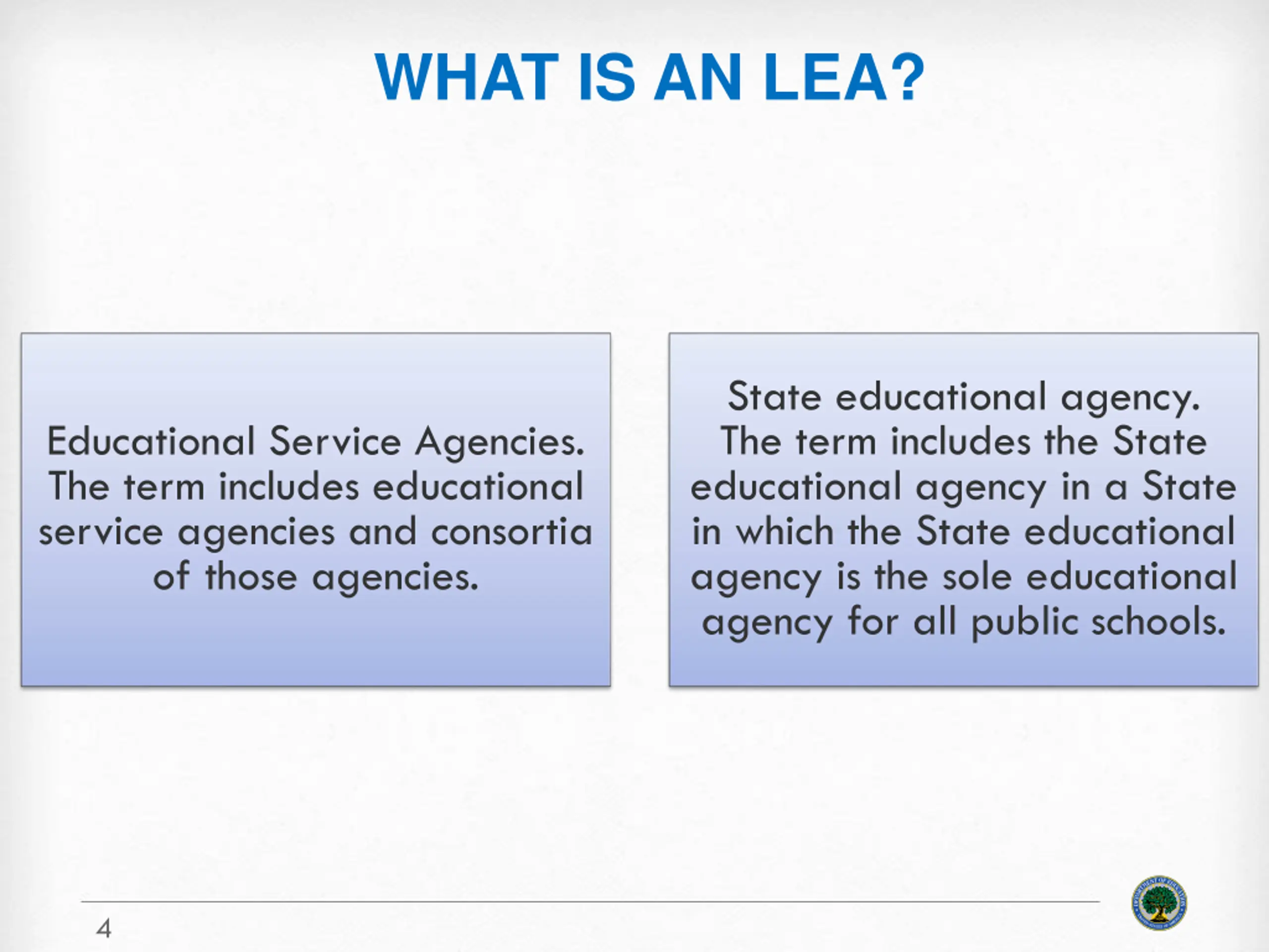 WHAT IS AN LEA? State educational agency. The term includes the State educational agency in a State in which the State educational agency is the sole educational agency for all public schools. Educational Service Agencies. The term includes educational service agencies and consortia of those agencies. 4