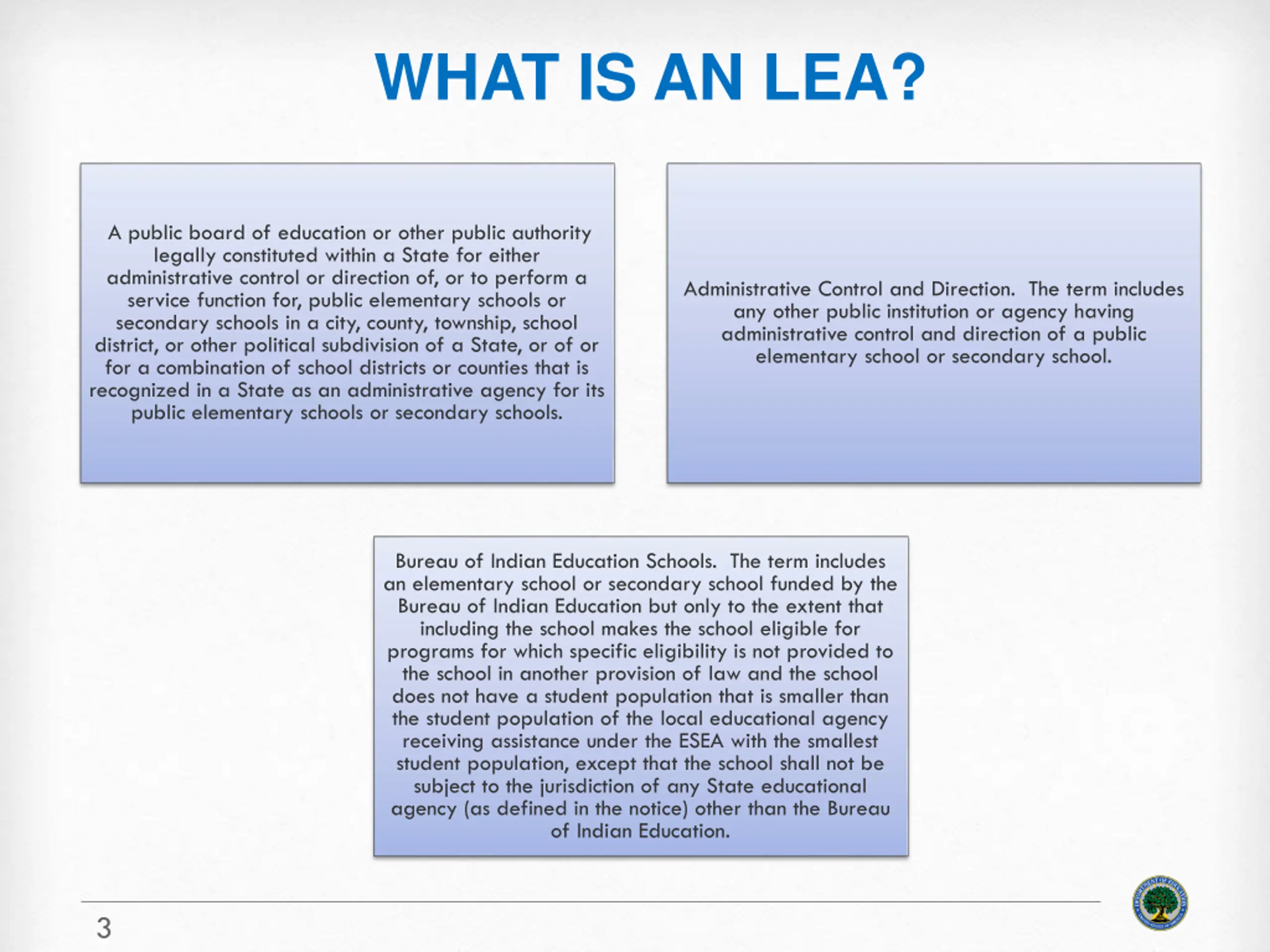 WHAT IS AN LEA? A public board of education or other public authority legally constituted within a State for either administrative control or direction of, or to perform a service function for, public elementary schools or secondary schools in a city, county, township, school district, or other political subdivision of a State, or of or for a combination of school districts or counties that is recognized in a State as an administrative agency for its public elementary schools or secondary schools. Administrative Control and Direction. The term includes any other public institution or agency having administrative control and direction of a public elementary school or secondary school. Bureau of Indian Education Schools. The term includes an elementary school or secondary school funded by the Bureau of Indian Education but only to the extent that including the school makes the school eligible for programs for which specific eligibility is not provided to the school in another provision of law and the school does not have a student population that is smaller than the student population of the local educational agency receiving assistance under the ESEA with the smallest student population, except that the school shall not be subject to the jurisdiction of any State educational agency (as defined in the notice) other than the Bureau of Indian Education. 3