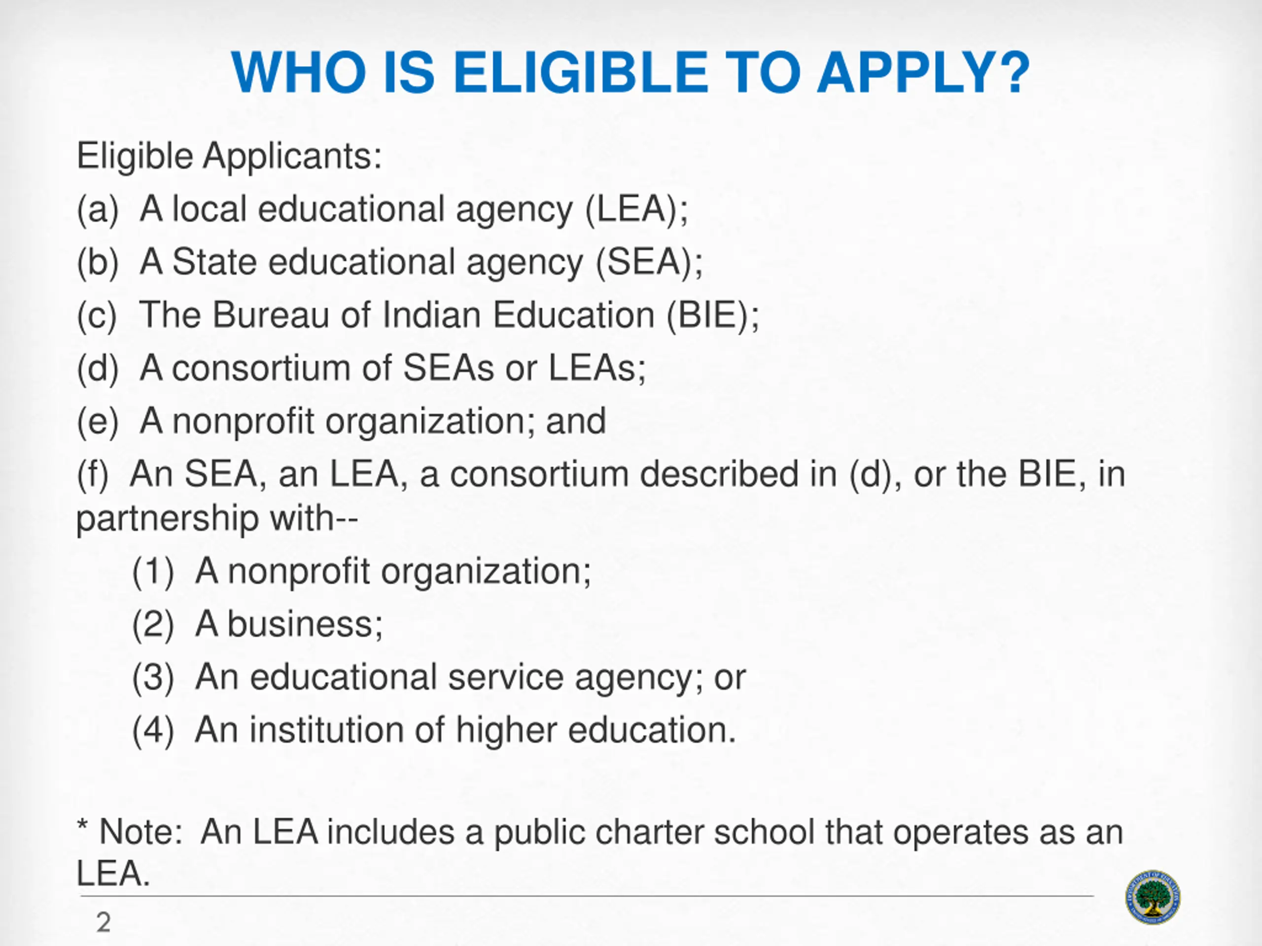 WHO IS ELIGIBLE TO APPLY? Eligible Applicants: (a) A local educational agency (LEA); (b) A State educational agency (SEA); (c) The Bureau of Indian Education (BIE); (d) A consortium of SEAs or LEAs; (e) A nonprofit organization; and (f) An SEA, an LEA, a consortium described in (d), or the BIE, in partnership with-- (1) A nonprofit organization; (2) A business; (3) An educational service agency; or (4) An institution of higher education. * Note: An LEA includes a public charter school that operates as an LEA. 2