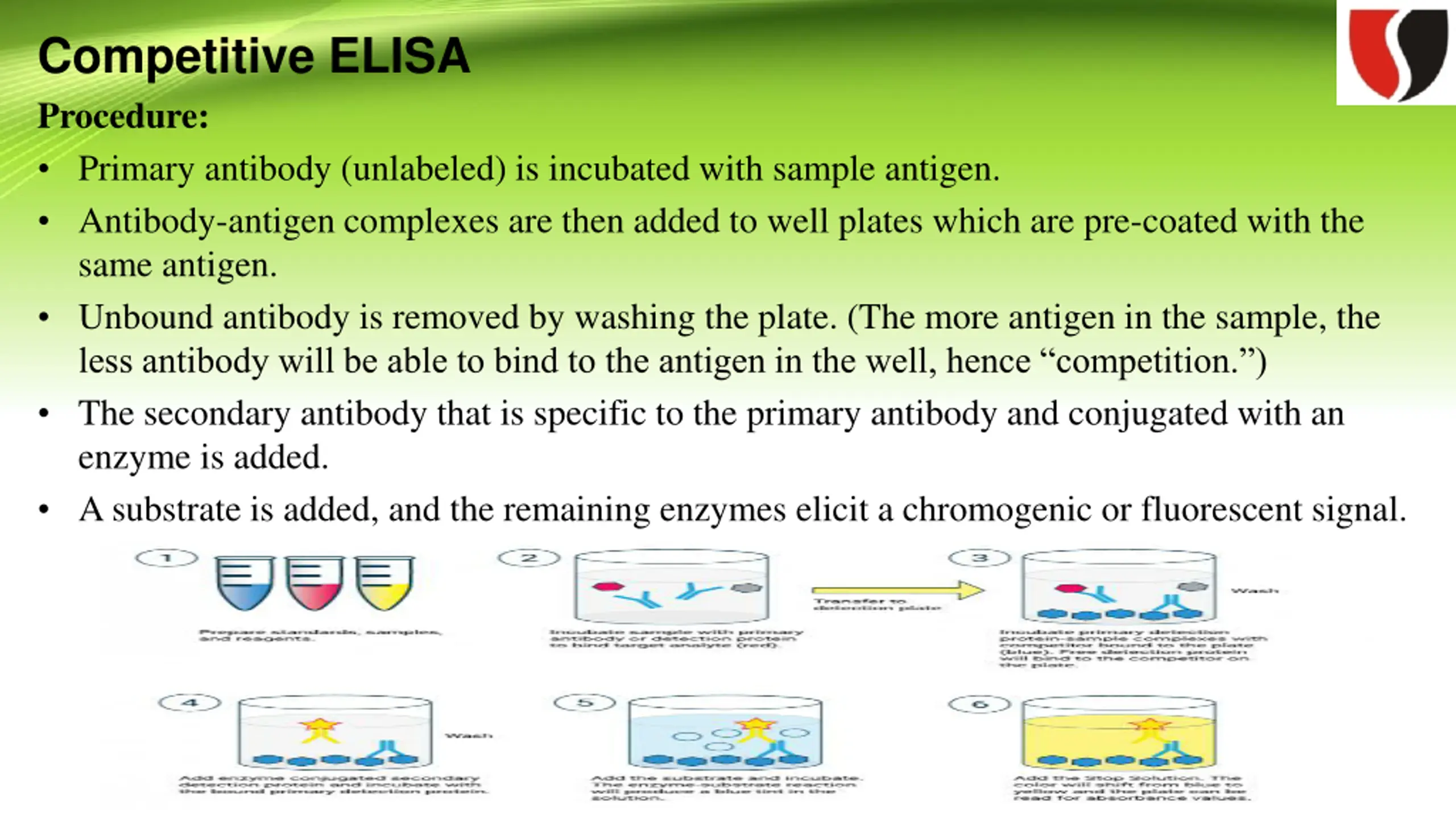 Competitive ELISA Procedure: Primary antibody (unlabeled) is incubated with sample antigen. Antibody-antigen complexes are then added to well plates which are pre-coated with the same antigen. Unbound antibody is removed by washing the plate. (The more antigen in the sample, the less antibody will be able to bind to the antigen in the well, hence competition. ) The secondary antibody that is specific to the primary antibody and conjugated with an enzyme is added. A substrate is added, and the remaining enzymes elicit a chromogenic or fluorescent signal.