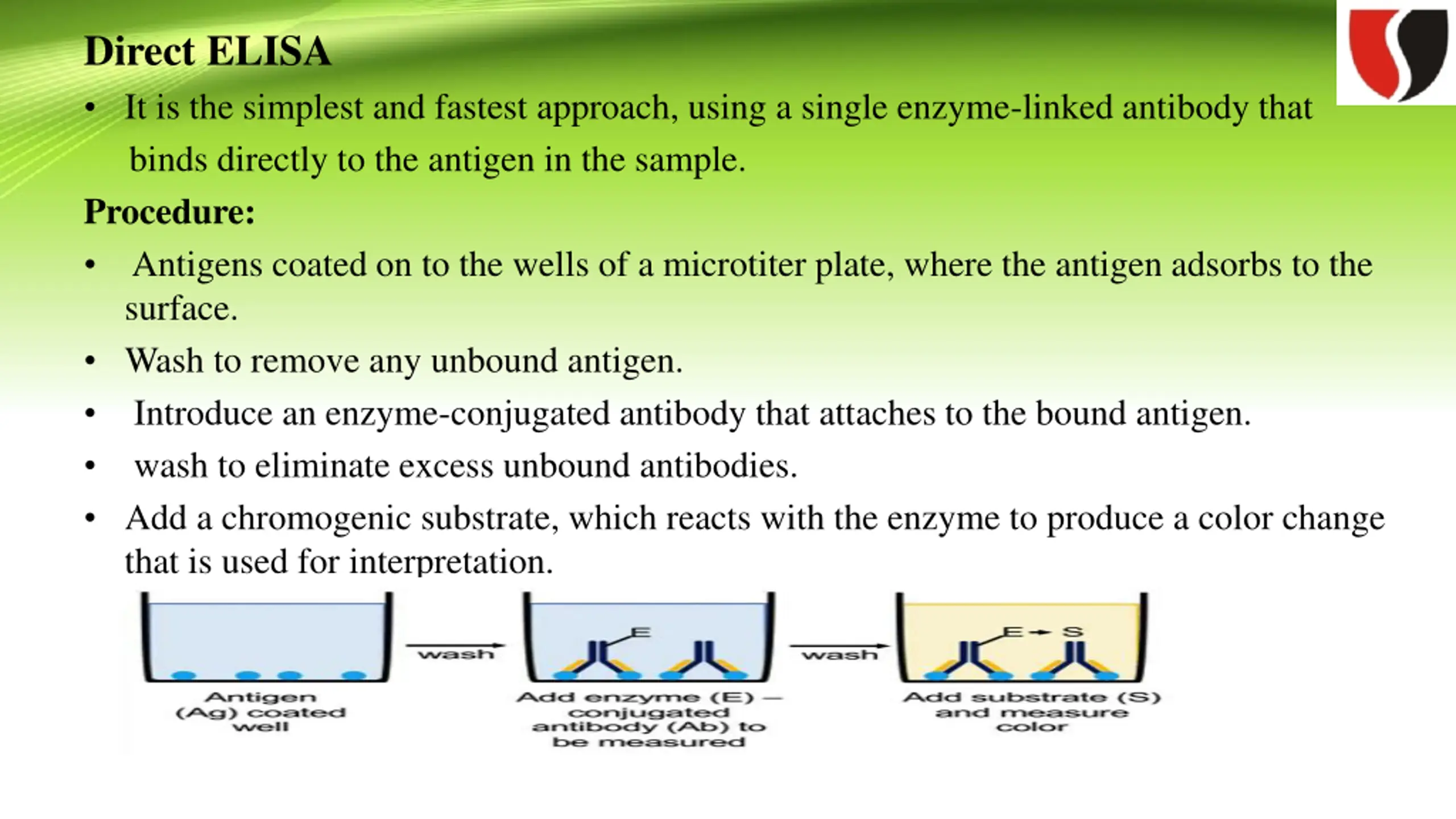 Direct ELISA It is the simplest and fastest approach, using a single enzyme-linked antibody that binds directly to the antigen in the sample. Procedure: Antigens coated on to the wells of a microtiter plate, where the antigen adsorbs to the surface. Wash to remove any unbound antigen. Introduce an enzyme-conjugated antibody that attaches to the bound antigen. wash to eliminate excess unbound antibodies. Add a chromogenic substrate, which reacts with the enzyme to produce a color change that is used for interpretation.