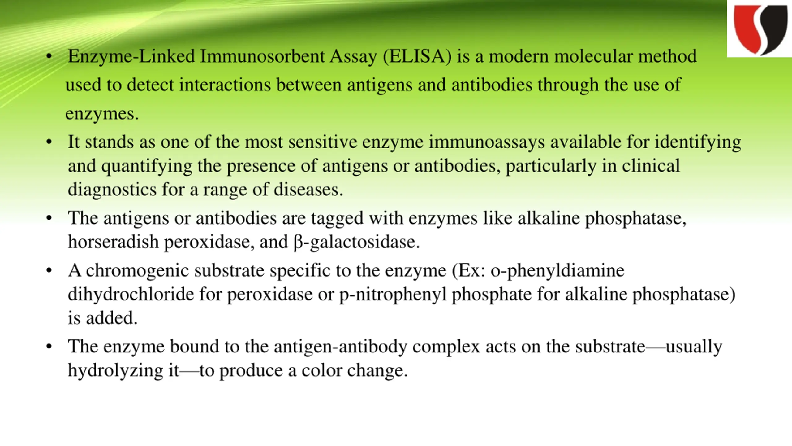 Enzyme-Linked Immunosorbent Assay (ELISA) is a modern molecular method used to detect interactions between antigens and antibodies through the use of enzymes. It stands as one of the most sensitive enzyme immunoassays available for identifying and quantifying the presence of antigens or antibodies, particularly in clinical diagnostics for a range of diseases. The antigens or antibodies are tagged with enzymes like alkaline phosphatase, horseradish peroxidase, and -galactosidase. Achromogenic substrate specific to the enzyme (Ex: o-phenyldiamine dihydrochloride for peroxidase or p-nitrophenyl phosphate for alkaline phosphatase) is added. The enzyme bound to the antigen-antibody complex acts on the substrate usually hydrolyzing it to produce a color change.