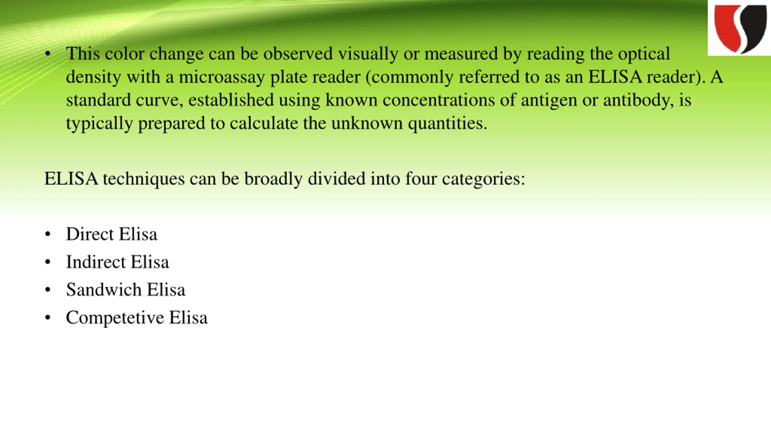 This color change can be observed visually or measured by reading the optical density with a microassay plate reader (commonly referred to as an ELISA reader). A standard curve, established using known concentrations of antigen or antibody, is typically prepared to calculate the unknown quantities. ELISA techniques can be broadly divided into four categories: Direct Elisa Indirect Elisa Sandwich Elisa Competetive Elisa