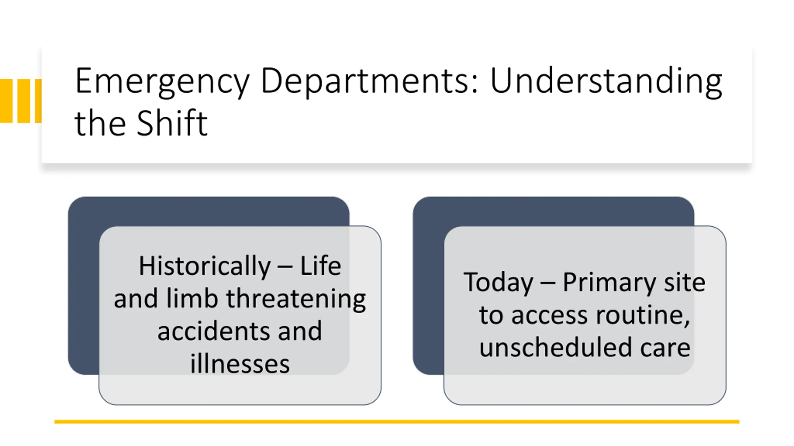 Emergency Departments: Understanding the Shift Historically Life and limb threatening accidents and illnesses Today Primary site to access routine, unscheduled care