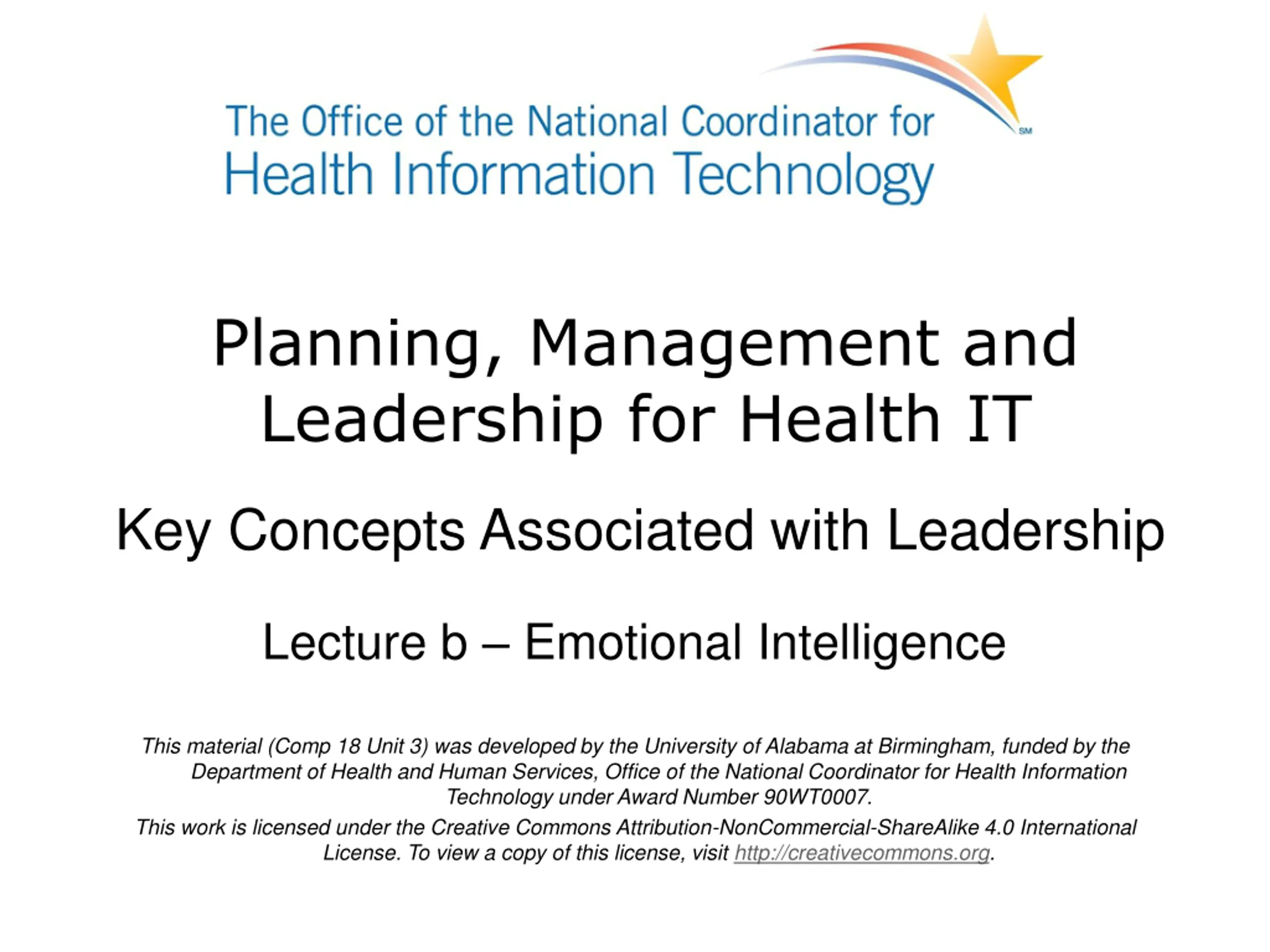 Planning, Management and Leadership for Health IT Key Concepts Associated with Leadership Lecture b Emotional Intelligence This material (Comp 18 Unit 3) was developed by the University of Alabama at Birmingham, funded by the Department of Health and Human Services, Office of the National Coordinator for Health Information Technology under Award Number 90WT0007. This work is licensed under the Creative Commons Attribution-NonCommercial-ShareAlike 4.0 International License. To view a copy of this license, visit http://creativecommons.org.